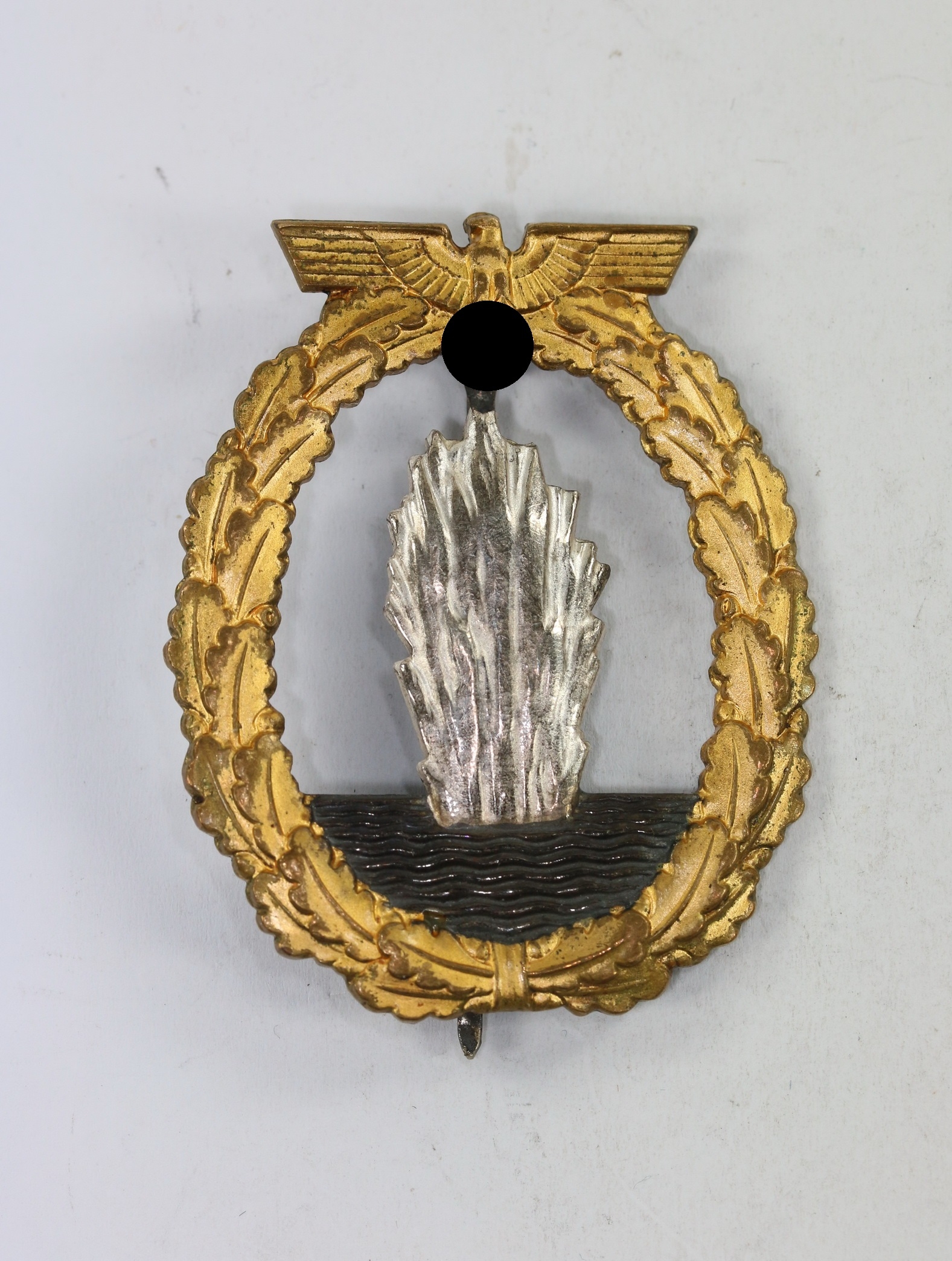 Buntmetall, excellenter, ungetragener Zustand. Der Kranz mit vollständiger,strahlender Vergoldung, die Fontäne mit vollständiger, frostiger Versilberung. Das Wasser mit vollständiger, dunkler Tönung. Mit Hersteller „Schwerin Berlin“. Siehe GCA-Datenbank.