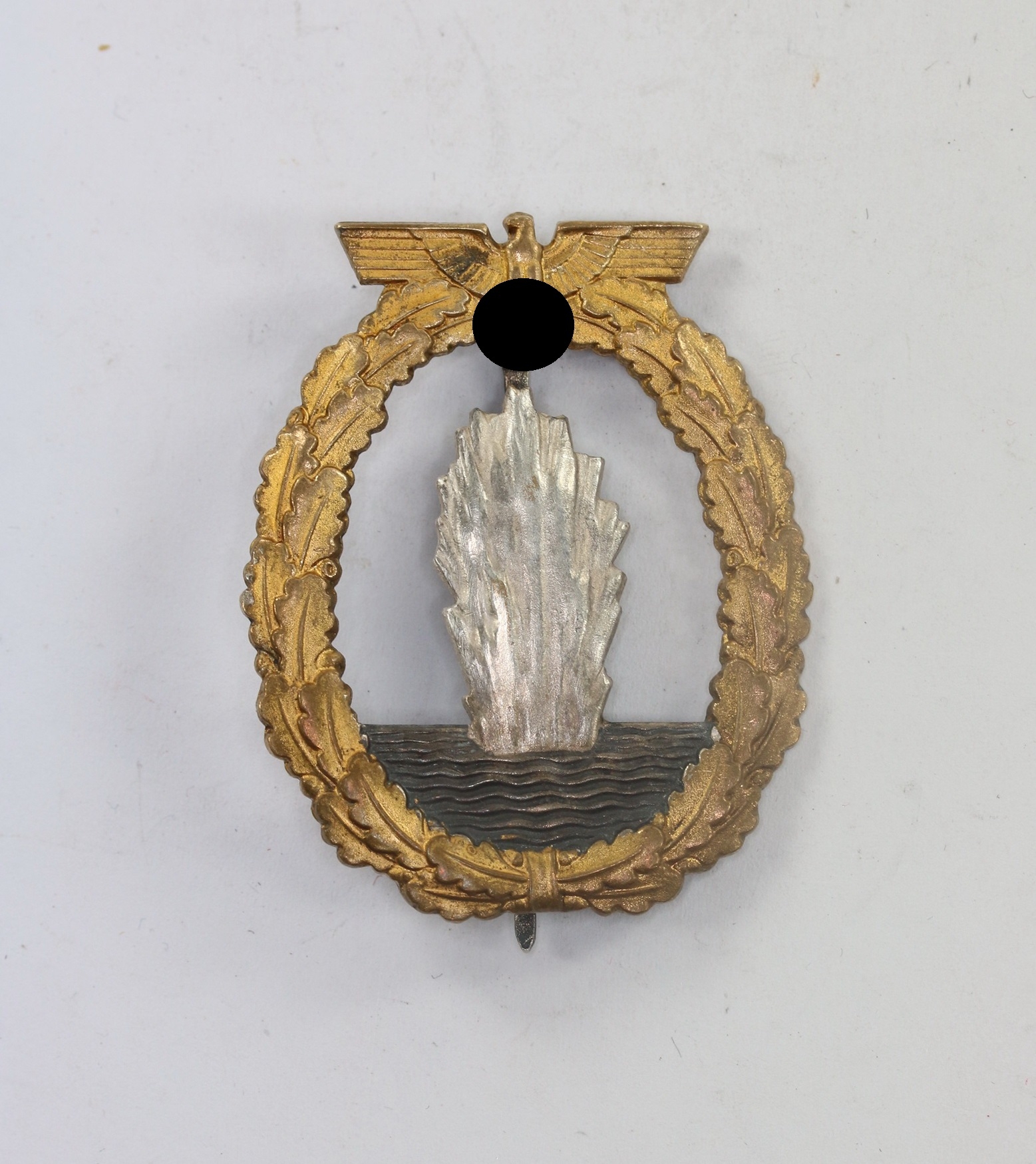 Buntmetall, sehr guter, nahe zu ungetragener Zustand. Der Kranz mit vollständiger Vergoldung, die Fontäne mit vollständiger, frostiger Versilberung. Das Wasser mit vollständiger, dunkler Tönung. Mit Hersteller „Schwerin Berlin“. Siehe GCA-Datenbank.