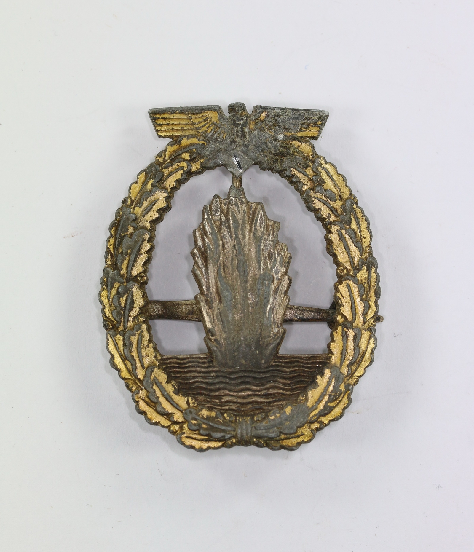 Zink, entnazifiziert, sonst sehr guter, leicht getragener Zustand. Ohne Hersteller, aber eine bekannte Variante. Das Abzeichen wurde entnazifiziert, um in der Kriegsgefangenschaft weiter getragen werden zu können.