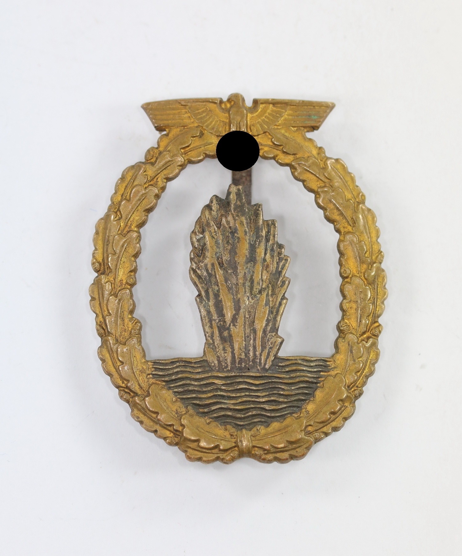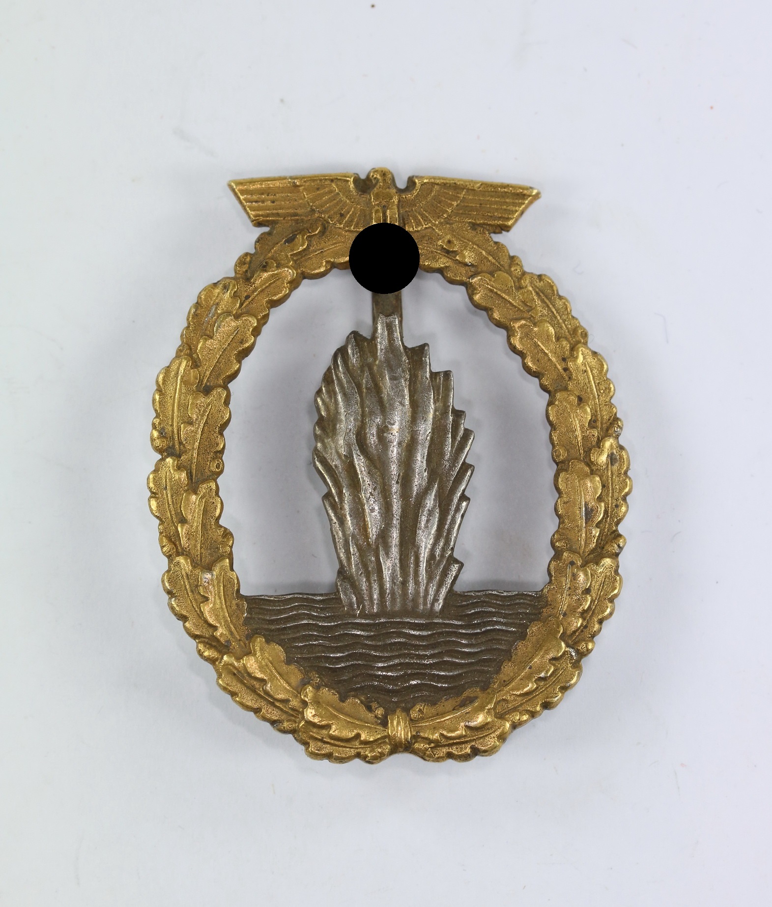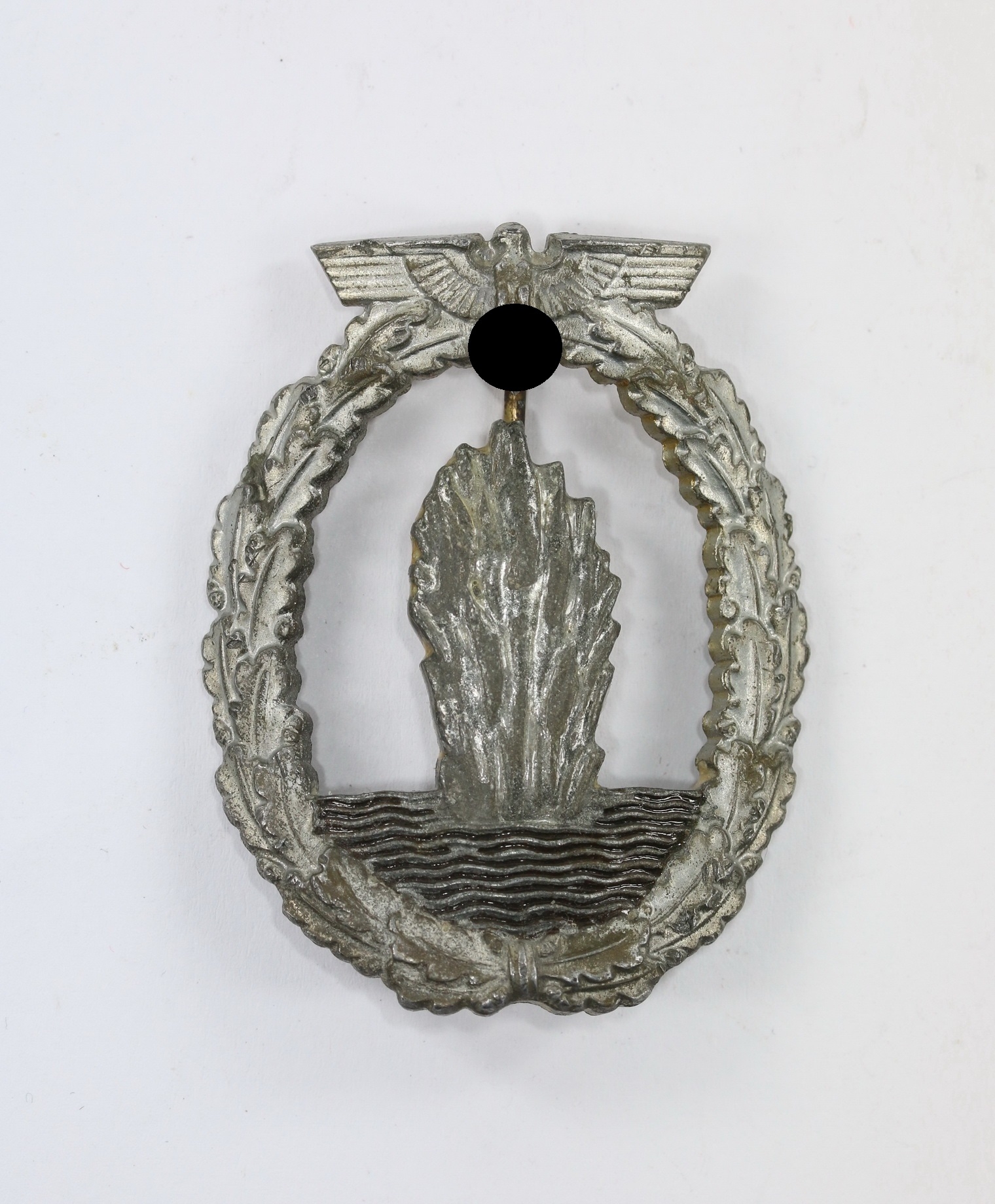 Zink, sehr guter, leicht getragener Zustand. Ohne Hersteller, aber eine bekannte Variante der Firma Steinhauer & Lück, Lüdenscheid. Siehe Weber/Skora, Die Kriegsabzeichen der Kriegsmarine. Stark gewölbt.