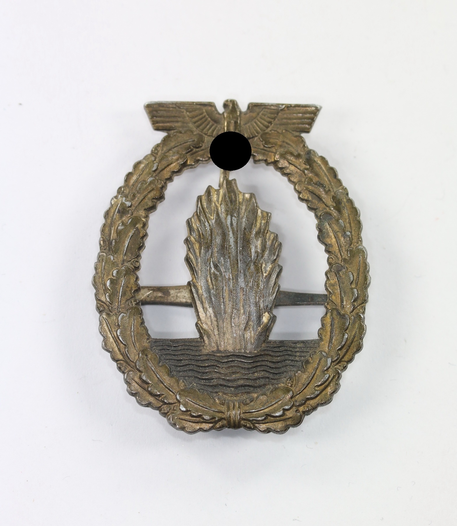 Buntmetall, sehr guter, getragener Zustand. Mit Patina. Ohne Hersteller, aber eine bekannte Variante der Firma Wilhelm Deumer, Lüdenscheid. Siehe Weber/Skora, Die Kriegsabzeichen der Kriegsmarine.