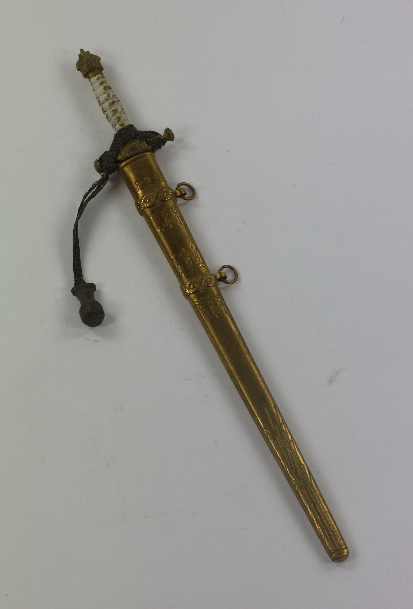 Metall, sehr guter, leicht gebrauchter Zustand. Ohne Fehler, die Klinge blank. Die Scheide ohne Fehler. Gesamtlänge ca. 20,5 cm, Klingenlänge ca. 11,2 cm.