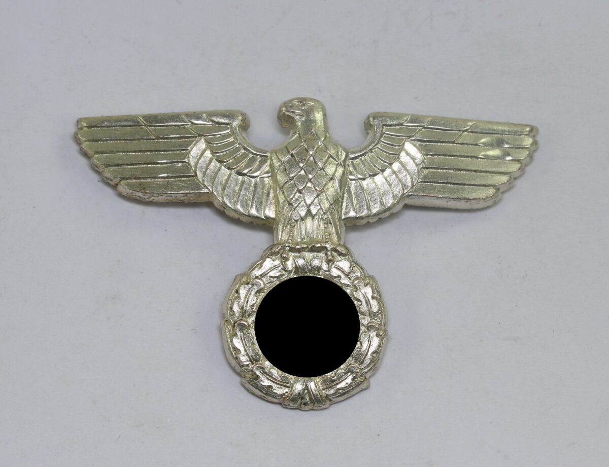 Cupal(!), excellenter, ungetragener Zustand. Mit vollständiger Versilberung, die Splinte einwandfrei. Rückseitig links in der Flügelspitze „RZM“ für Reichszeugmeisterei, rechts in der Flügelspitze der Hersteller Code „117“ für die Firma K. F. Vogelsang & Co., Lüdenscheid. Maße: Breite 57 mm, Höhe 32 mm.