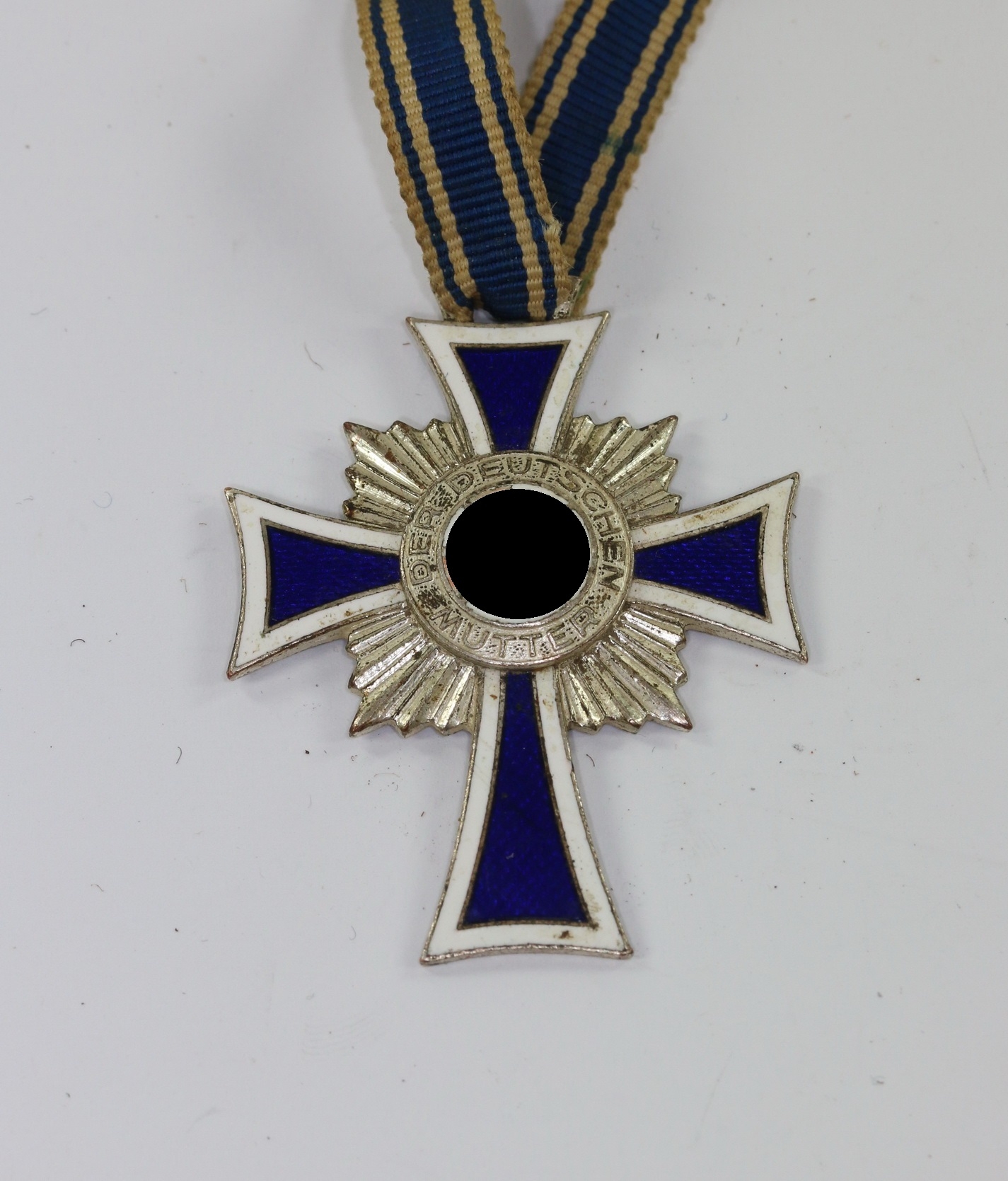 Buntmetall, sehr guter, getragener Zustand. Die Emaille mit leichten Fehlern, die Versilberung vollständig vorhanden. Ohne Hersteller, aber eine bekannte Variante. Mit Trageband.