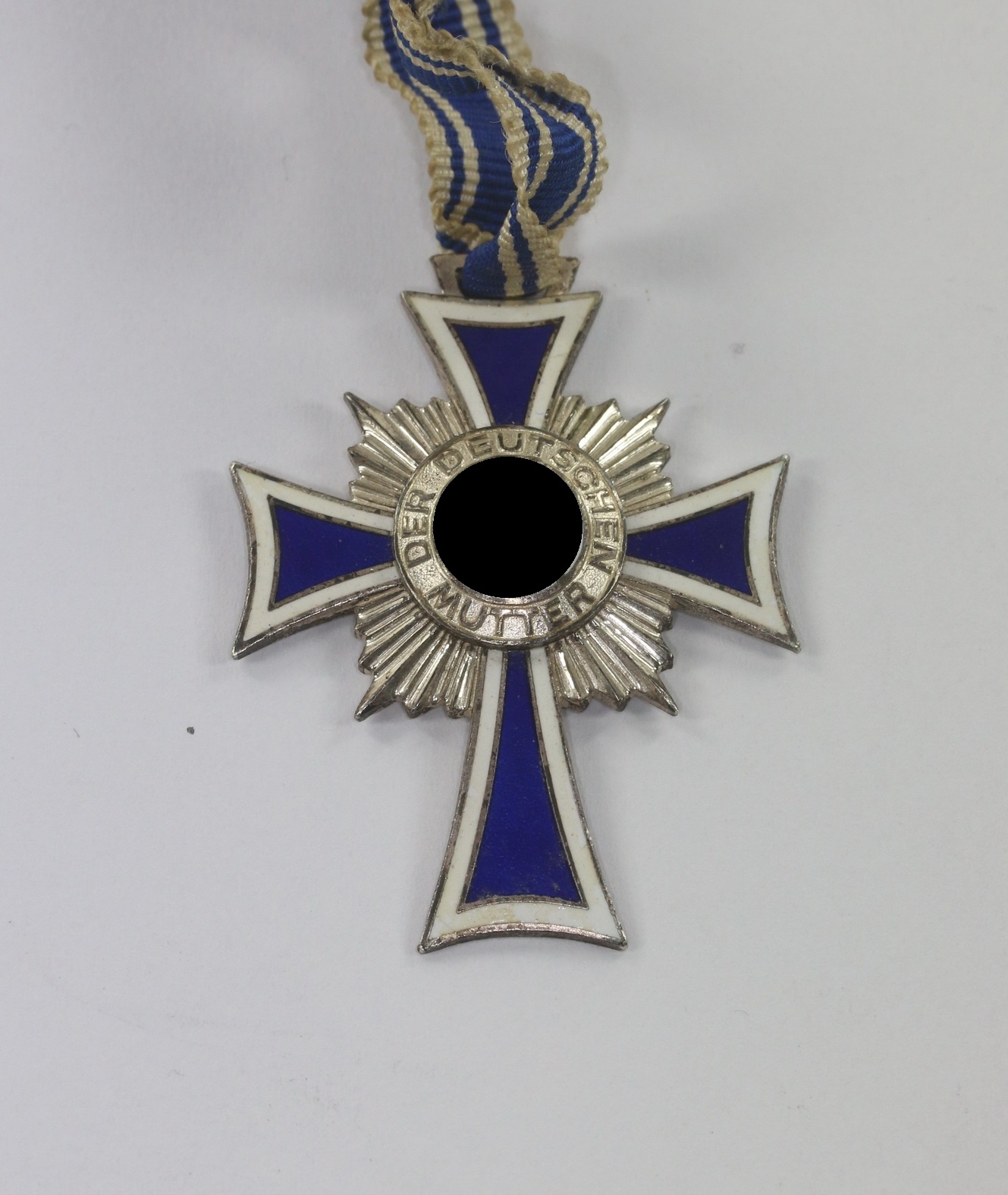 Buntmetall, sehr guter, nur minimal getragener Zustand. Die Emaille ohne Fehlern, die Versilberung vollständig vorhanden. Ohne Hersteller, aber eine bekannte Variante. Mit vernähten Trageband in voller Länge.