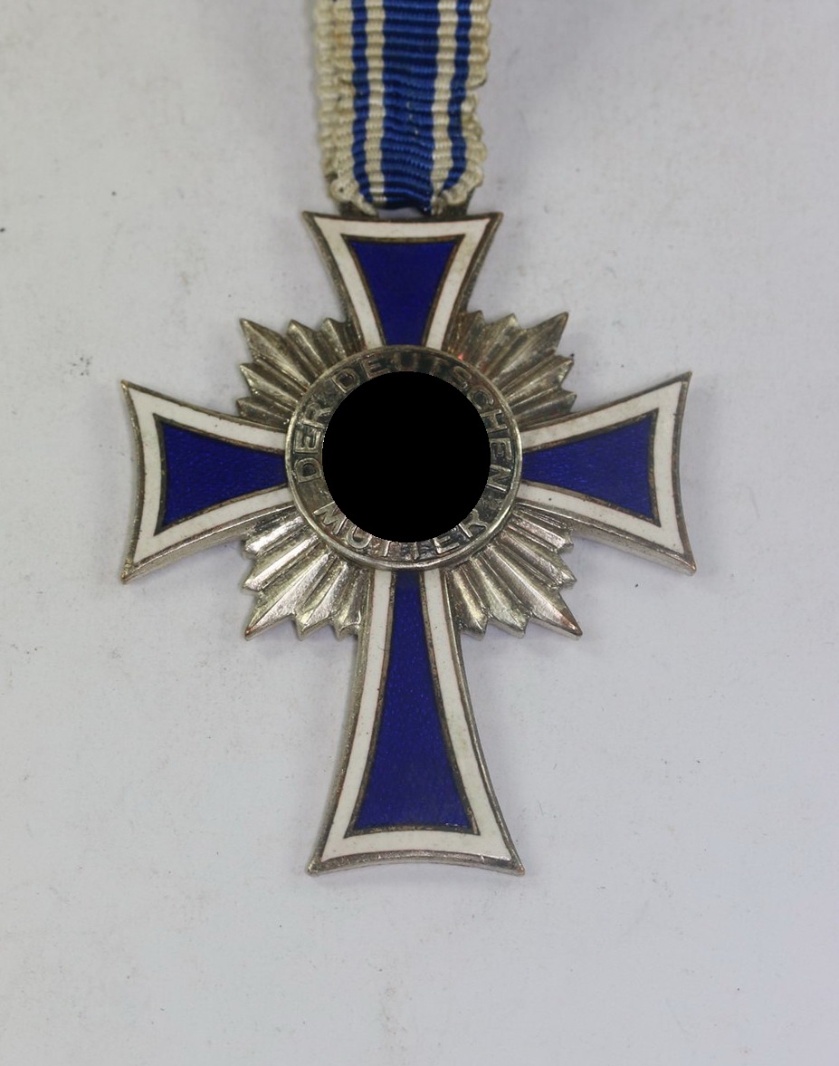 Das Mutterkreuz aus versilberten und vorderseitig emaillierten Buntmetall. Sehr guten, nur minimal getragener Zustand. Mit vollständiger, frostiger Versilberung, die Emaille ohne Fehler. Ohne Hersteller, aber eine bekannte Variante. Mit Trageband in voller Verleihungslänge.