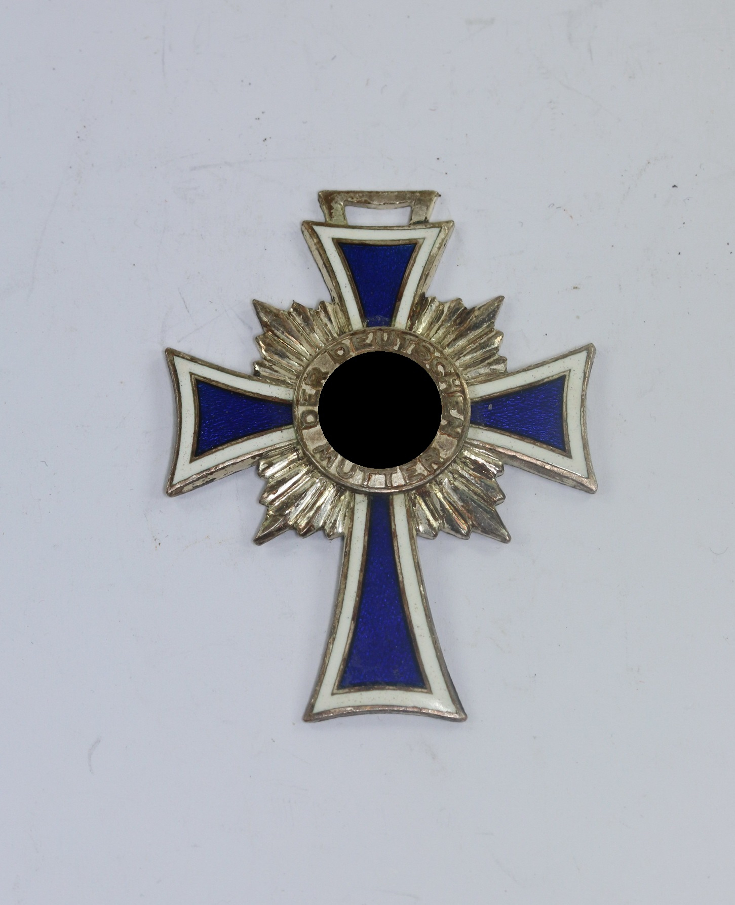 Buntmetall, sehr guter, leicht getragener Zustand. Die Emaille ohne Fehler, die Versilberung vollständig vorhanden. Ohne Hersteller, aber eine bekannte Variante. Mit Trageband.