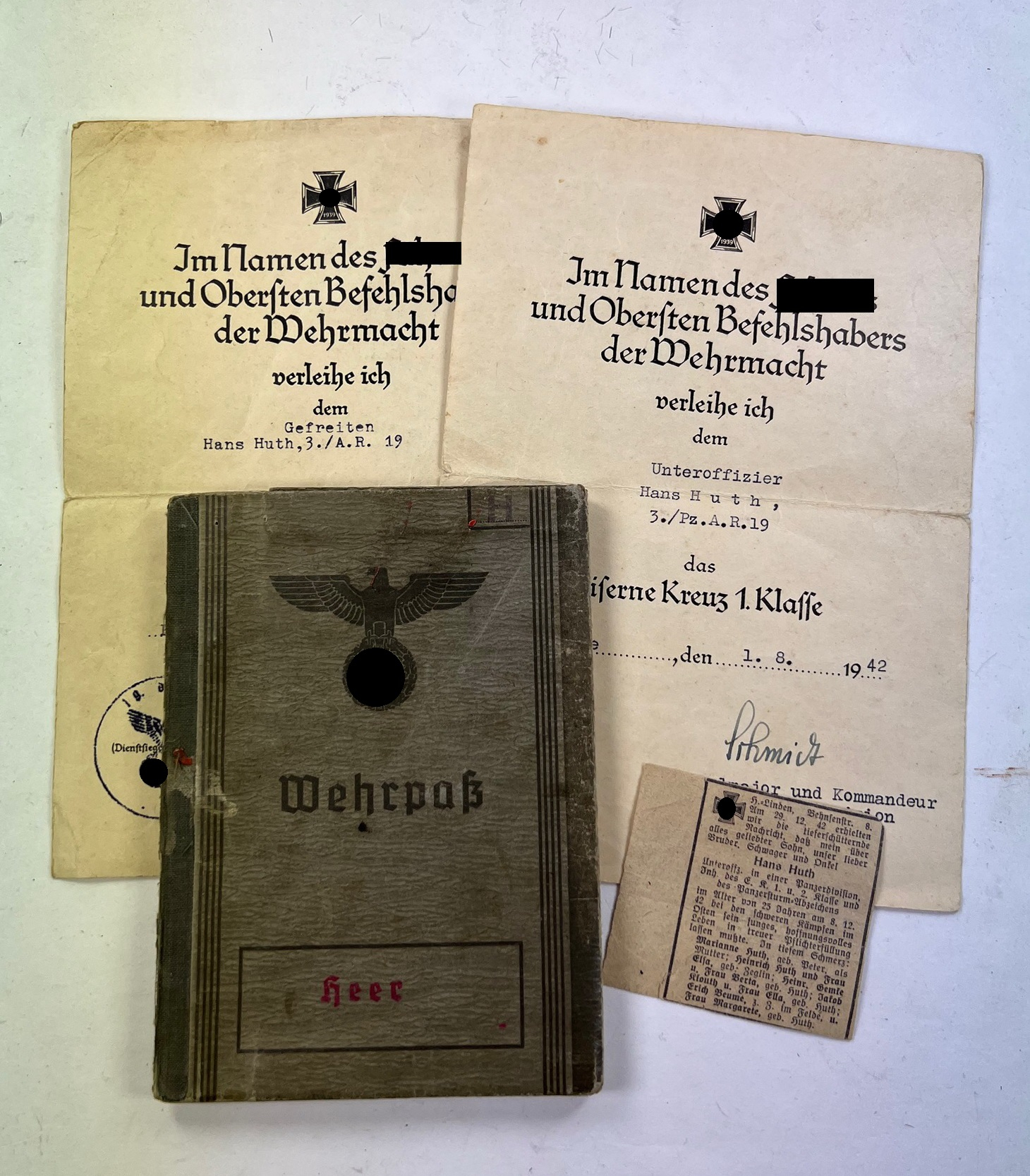 Nachlass des Unteroffizier Hans Huth. Er diente im Artillerie Regiment 19. Alle Dokumente in einen sehr guten, nur leicht gebrauchten Zustand. Der Nachlass bestht aus: