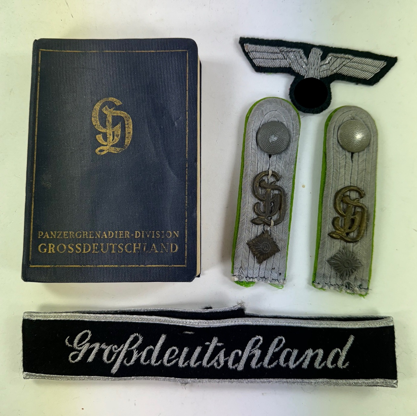 – Paar Schulterklappen für einen Oberleutnant. Waffenfarbe Wiesengrün für die Panzergrenadierttruppe. Mit „GD“ Matallauflagen für Großdeutschland. Eine Auflage mit abgebrochnen Splinten, diese mit Faden auf der Schulterklappe fixiert. Zum einnähen.