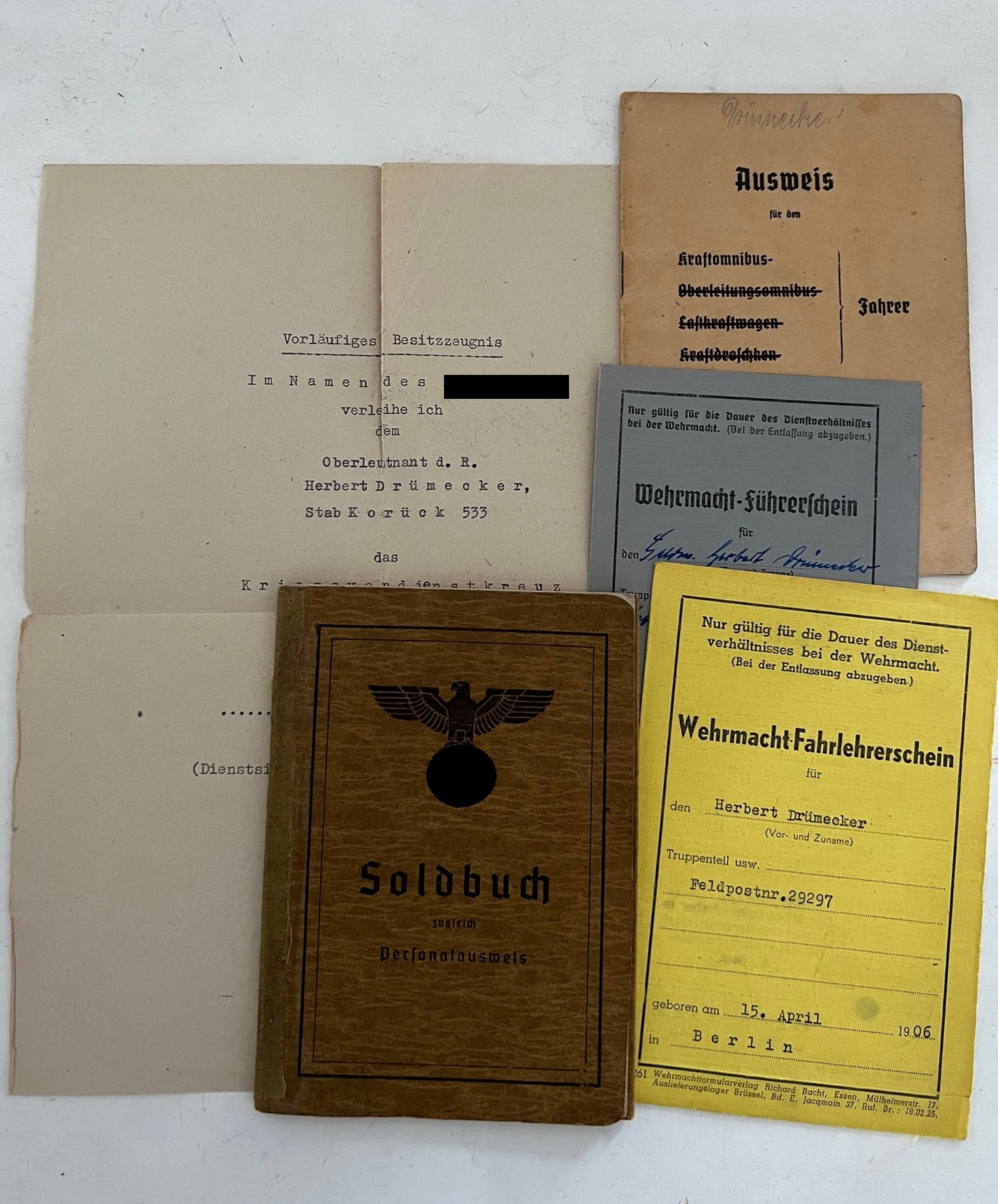 – Soldbuch, vollständig, sehr guter Zustand. Unter anderen mit eingetragener Nahkampfspange, Verwundetenabzeichen schwarz und silber, Infanteriesturmabzeichen und den Eisernen Kreuzen und Kriegsverdienstkreuzen mit schwertern, beider Klassen