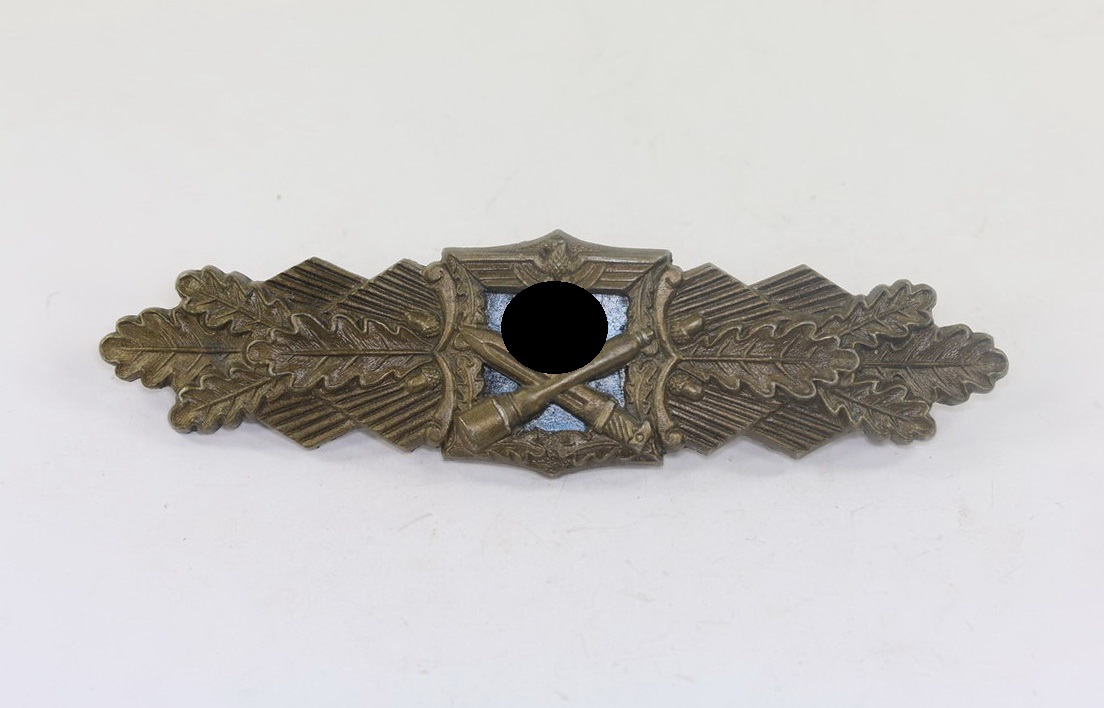 Nahkampfspange in Bronze, 15 Nahkampftage, nahkampf, weiß im Auge des Gegeners, mittig Hoheitsadler mit Hakenkreuz, Stielhandgranate gekreuzt mit Bajonette, Eichenlaub und Eicheln, Spange, Plättchen