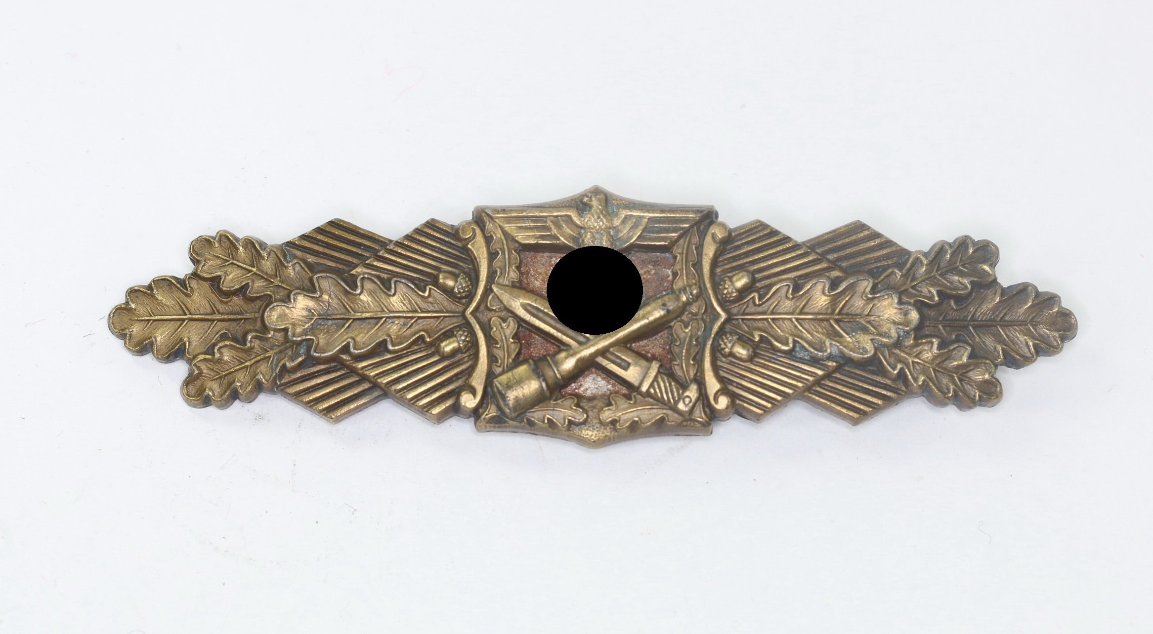 Zink, sehr guter, nur minimal getragener Zustand. Mit fast vollständiger, typischer Bronzierung. Das magnetische Plättchen noch fast vollständiger Schwärzung. Mit Hersteller „A.G.M.u.K.“ für die Arbeitsgemeinschaft Metalle und Kunststoffe, Gablonz. Mit gekehlter Nadel. Siehe Thomas Durante, The German Close Combat Clasp.