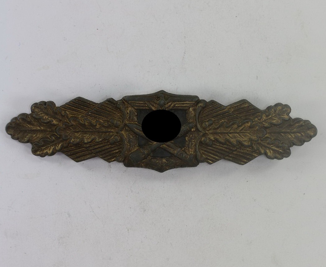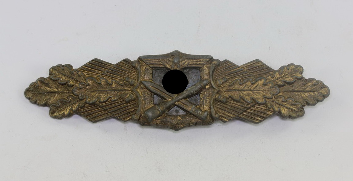 Nahkampfspange in Bronze. Die Spange aus bronzierten Zink. Sehr guter, nur minimal getragener Zustand. Mit fast vollständiger Bronzierung. Mit eingequetschten nicht magnetischen Plättchen aus Cupal, typisch für Nahkampfspangen der Firma Juncker. Rückseitig links vom Plättchen auf der Nahkampfspange „FEC. W.E. Peekhaus Berlin“ für den Künstler, der den Entwurf zur Nahkampfspange lieferte. Rechts die Siegnatur des Herstellers „Ausf. C.F. Juncker Berlin „. Die Tragenadel, auch typisch aus bronzierten Eisen.