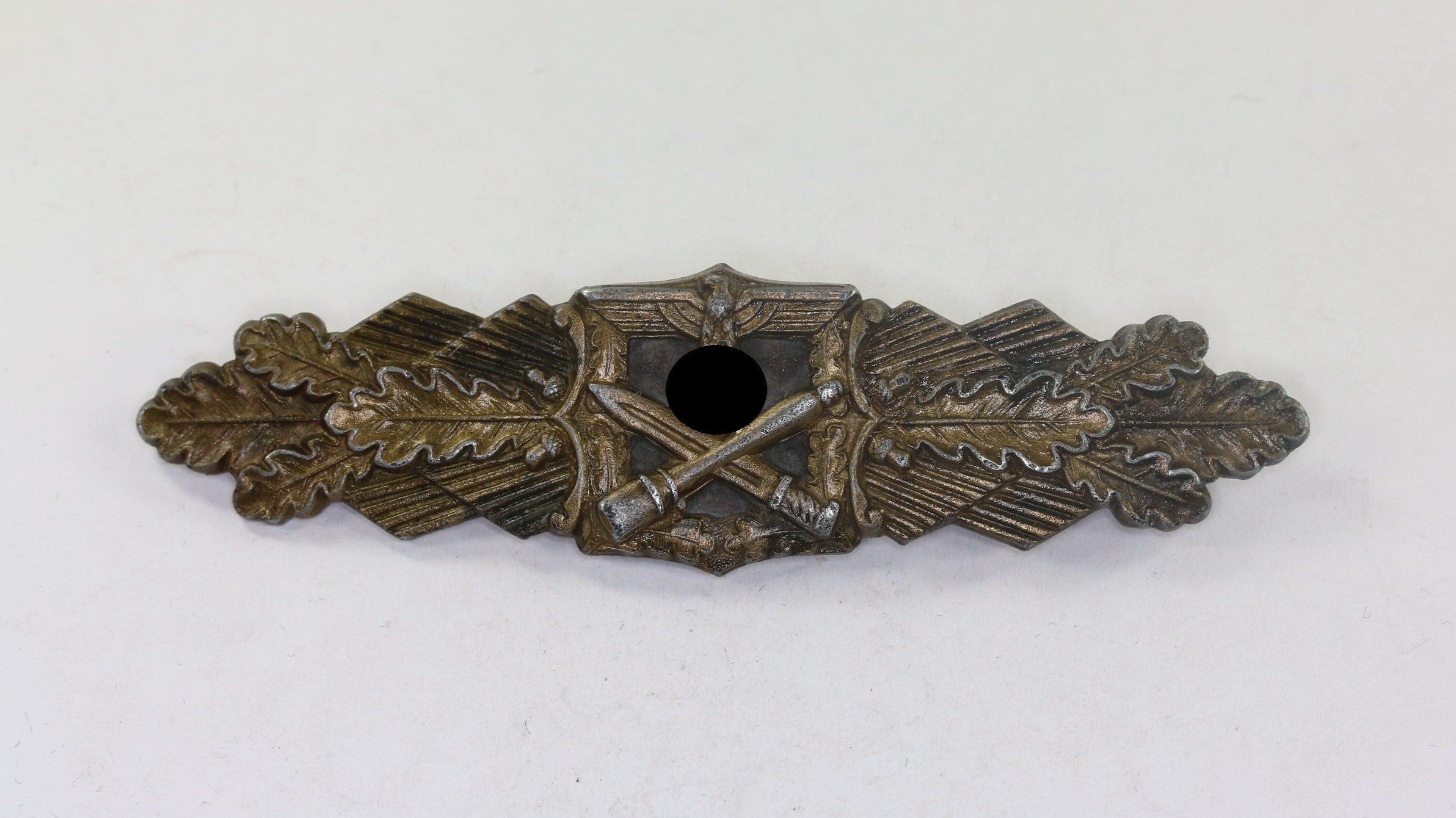 Zink, sehr guter, nur minimal getragener Zustand. Mit vollständiger Bronzierung. Das unmagnetische (typisch Juncker) Plättchen mit noch fast vollständig dunkler Tönung. Mit Hersteller „C.E. Juncker Berlin“. Siehe Thomas Durante, The German Close Combat Clasp.