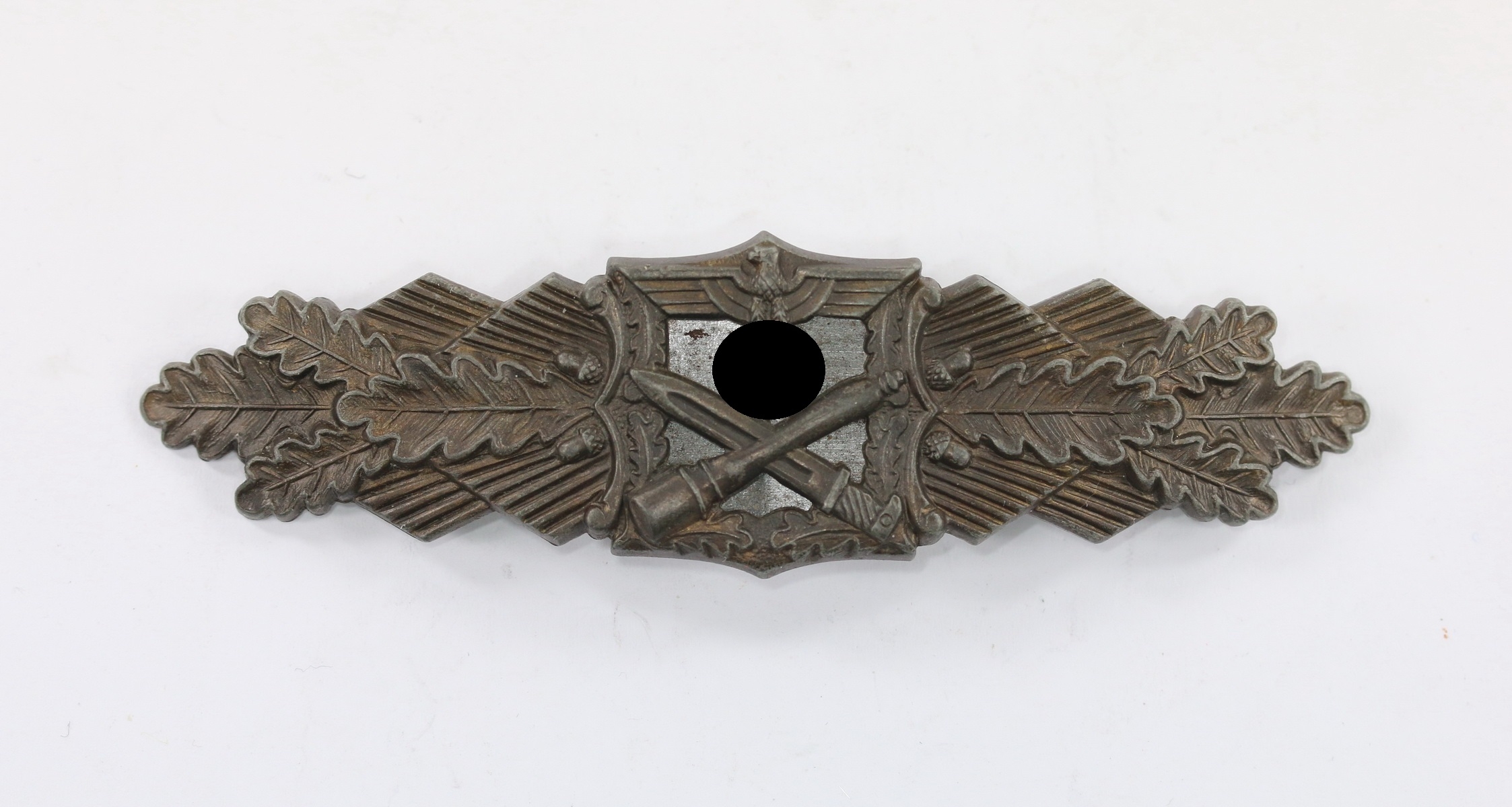 Zink, sehr guter, nahe zu ungetragener Zustand. Mit vollständiger, typisch dunkler Bronzierung. Das magnetische Plättchen mit vollständiger Schwärzung. Mit Hersteller „JFS“ für die Firma Josef Feix & Söhne, Gablonz. Siehe Thomas Durante, The German Close Combat Clasp, S. 172/171, Typ 1.12.1, 1. Modell. Stark gewölbte Ausführung.