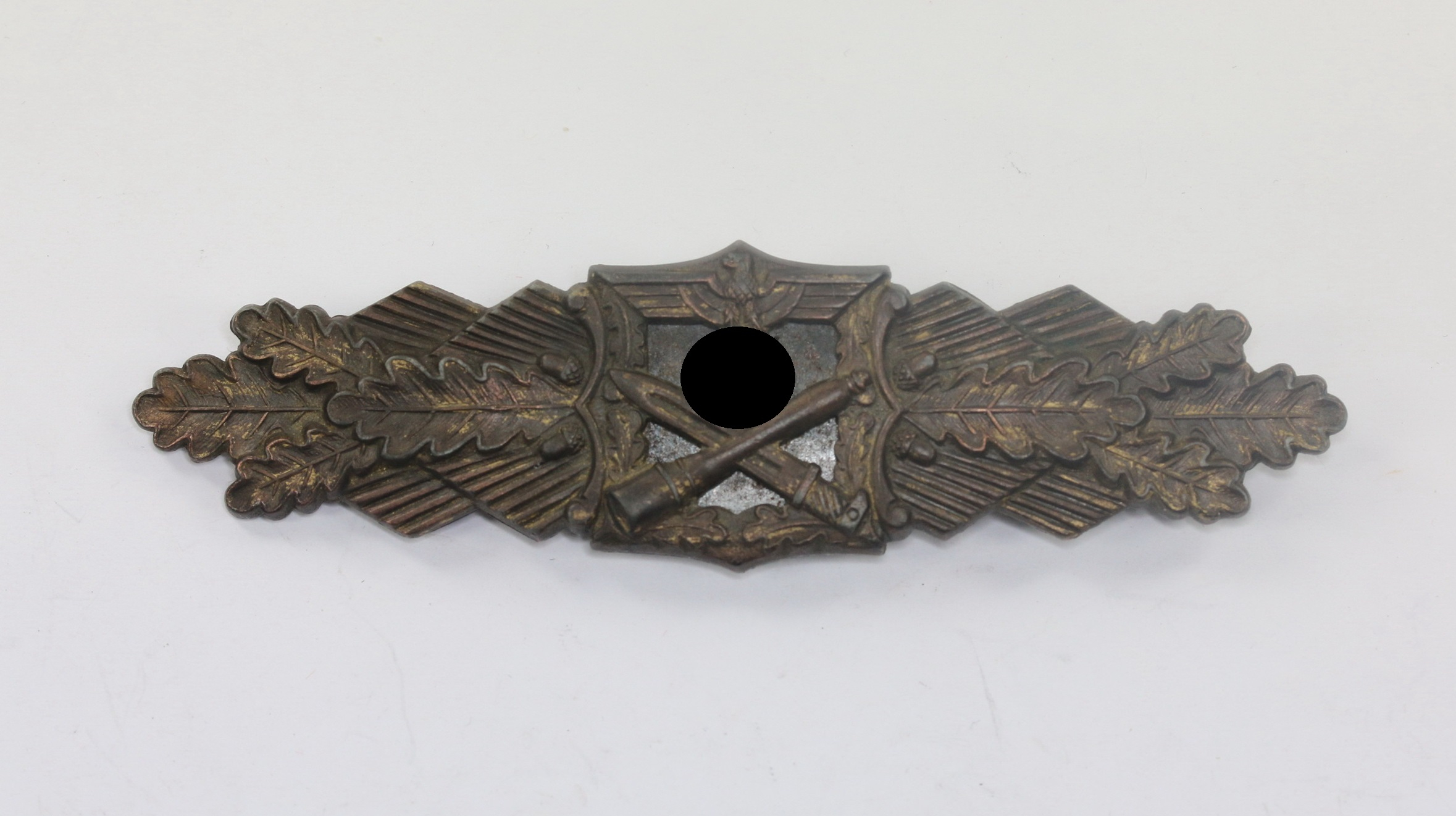 Zink, sehr guter, nahe zu ungetragener Zustand. Mit vollständiger, typischer Bronzierung. Das magnetische Plättchen mit vollständiger Schwärzung. Mit Hersteller „JFS“ für die Firma Josef Feix & Söhne, Gablonz. Siehe Thomas Durante, The German Close Combat Clasp.