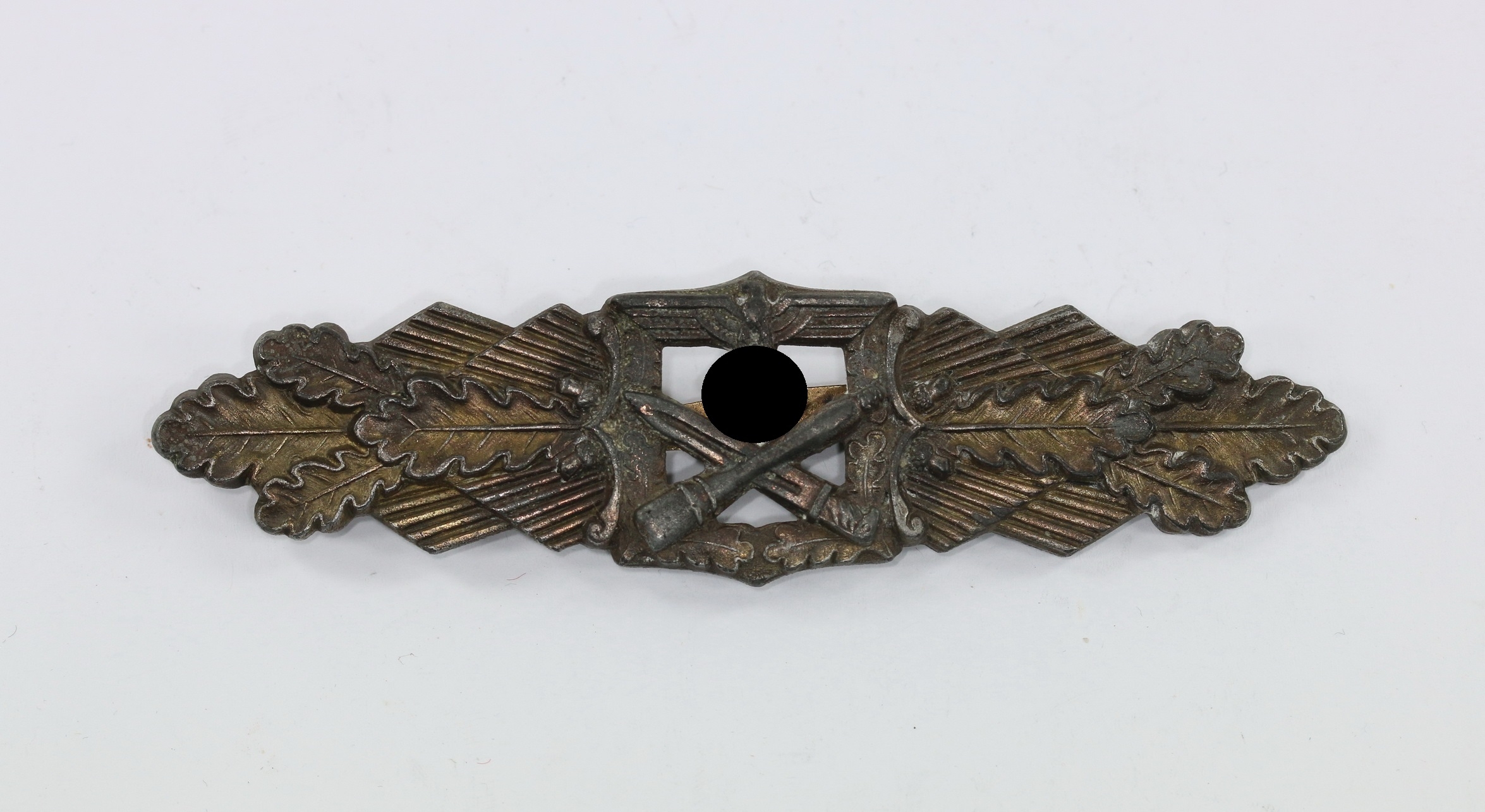 Zink, der Nadelhaken abgebrochen(!), das Plätzchen fehlt(!), sonst sehr guter, leicht getragener Zustand. Mit schöner Bronzierung. Mit Hersteller „C.E. Juncker Berlin“. Siehe Thomas Durante, The German Close Combat Clasp, S. 180/181, Typ 1.13.1.
