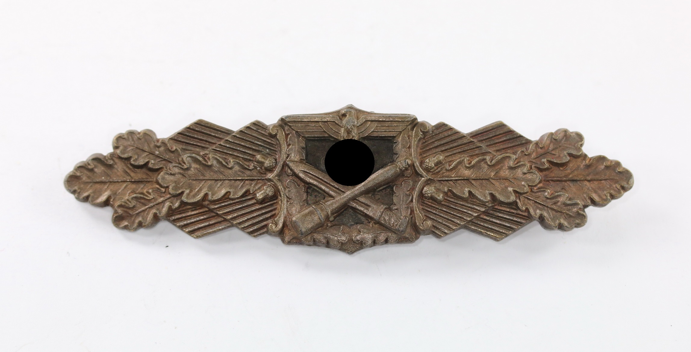 Zink, sehr guter, nahezu ungetragener Zustand. Mit vollständiger Bronzierung. Das unmagnetische (typisch Juncker) Plättchen mit noch vollständig dunkler Tönung. Mit Hersteller „C.E. Juncker Berlin“. Siehe Thomas Durante, The German Close Combat Clasp, S. 180/181, Typ 1.13.1.