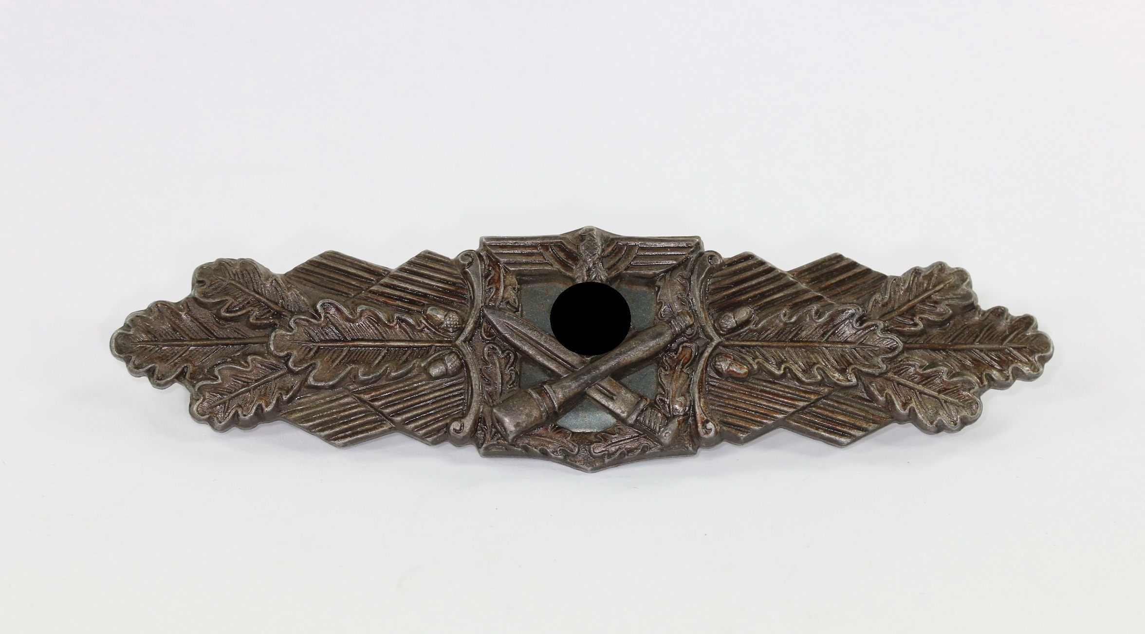 Zink, ein Stück der Nadel abgebrochen(!), sonst sehr guter, nur leicht getragener Zustand. Mit fast vollständiger Bronzierung. Das magnetische Plättchen mit noch schöner Tönung. Mit Hersteller „R. S.“ für die Firma Rudlof Souval, Wien. Siehe Thomas Durante, The German Close Combat Clasp.