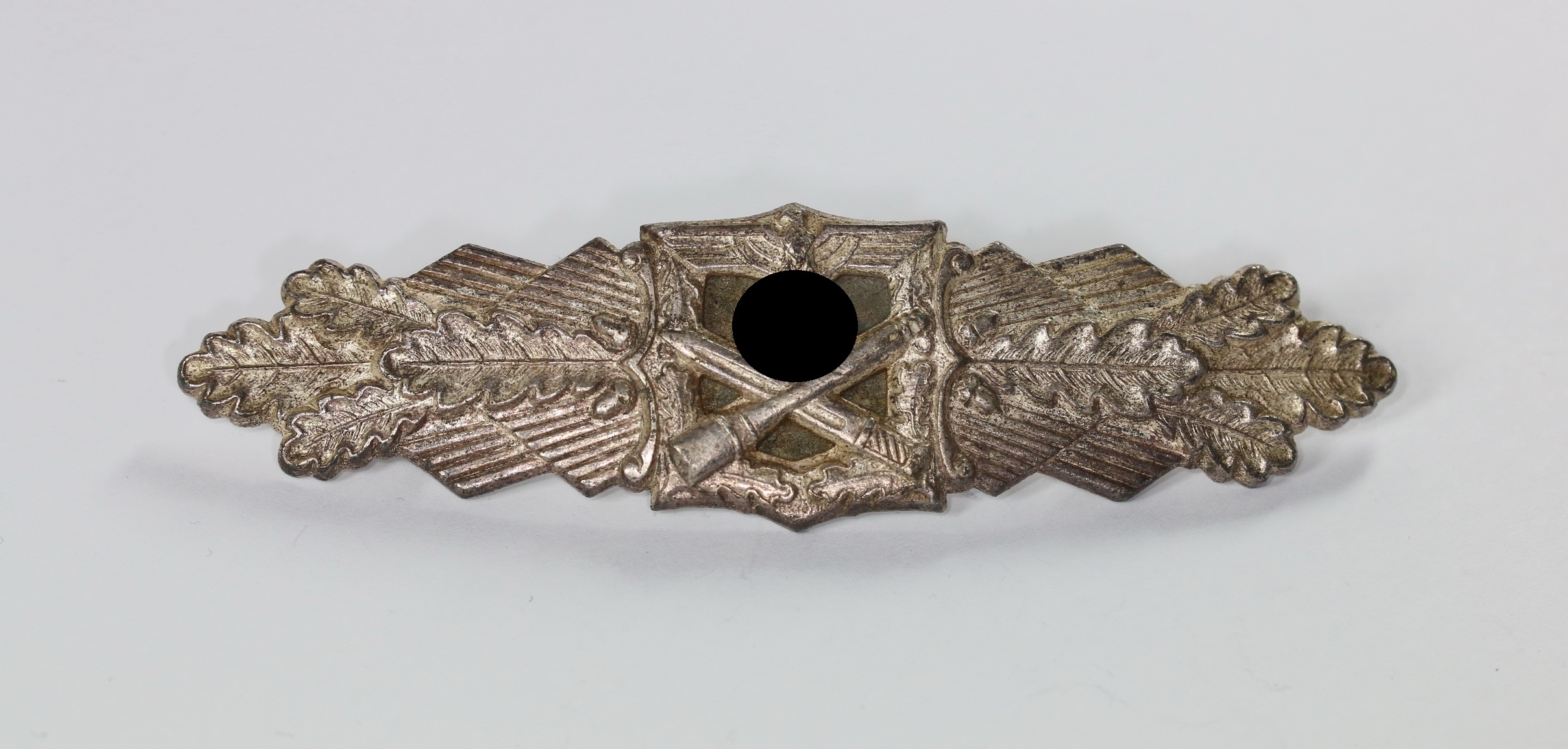 Zink, sehr guter, ungetragener Zustand. Mit vollständiger, frostiger Versilberung. Hakenkreuz und Kanten poliert. Mit minimalen Ansätzen von Patina. Das magnetische Plättchen mit vollständiger Tönung. Mit Hersteller „FLL“ für die Firma Friedrich Linden, Lüdenscheid. Siehe Thomas Durante, The German Close Combat Clasp.