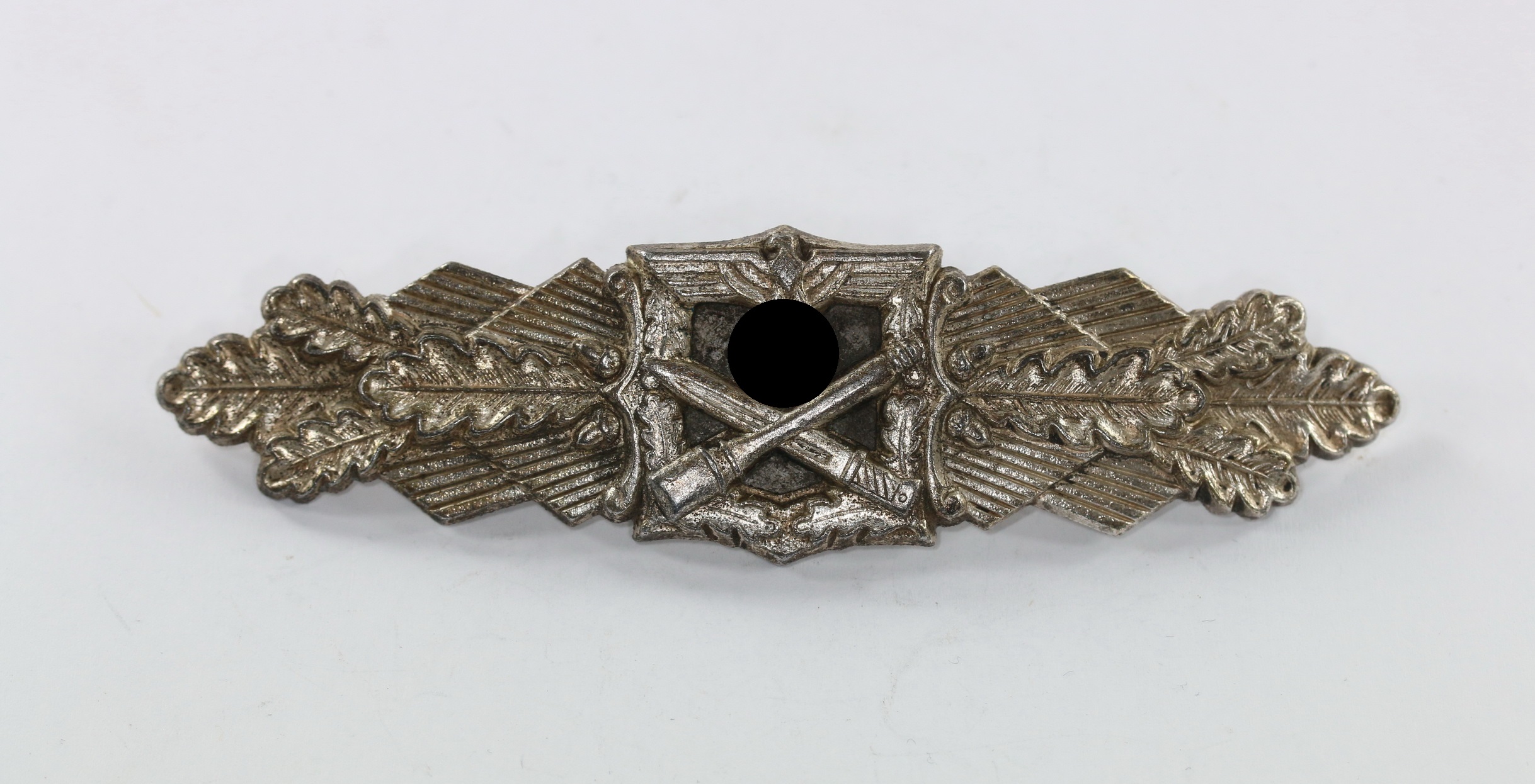 Zink, serh guter, nur minimal getragener Zustand. Mit vollständiger Versilberung. Mit leichter Patina. Das magnetische Plättchen mit noch schöner Tönung. Mit Hersteller „FLL“ für die Firma Friedrich Linden, Lüdenscheid. Siehe Thomas Durante, The German Close Combat Clasp, S. 188/189, Typ 1.14.1.