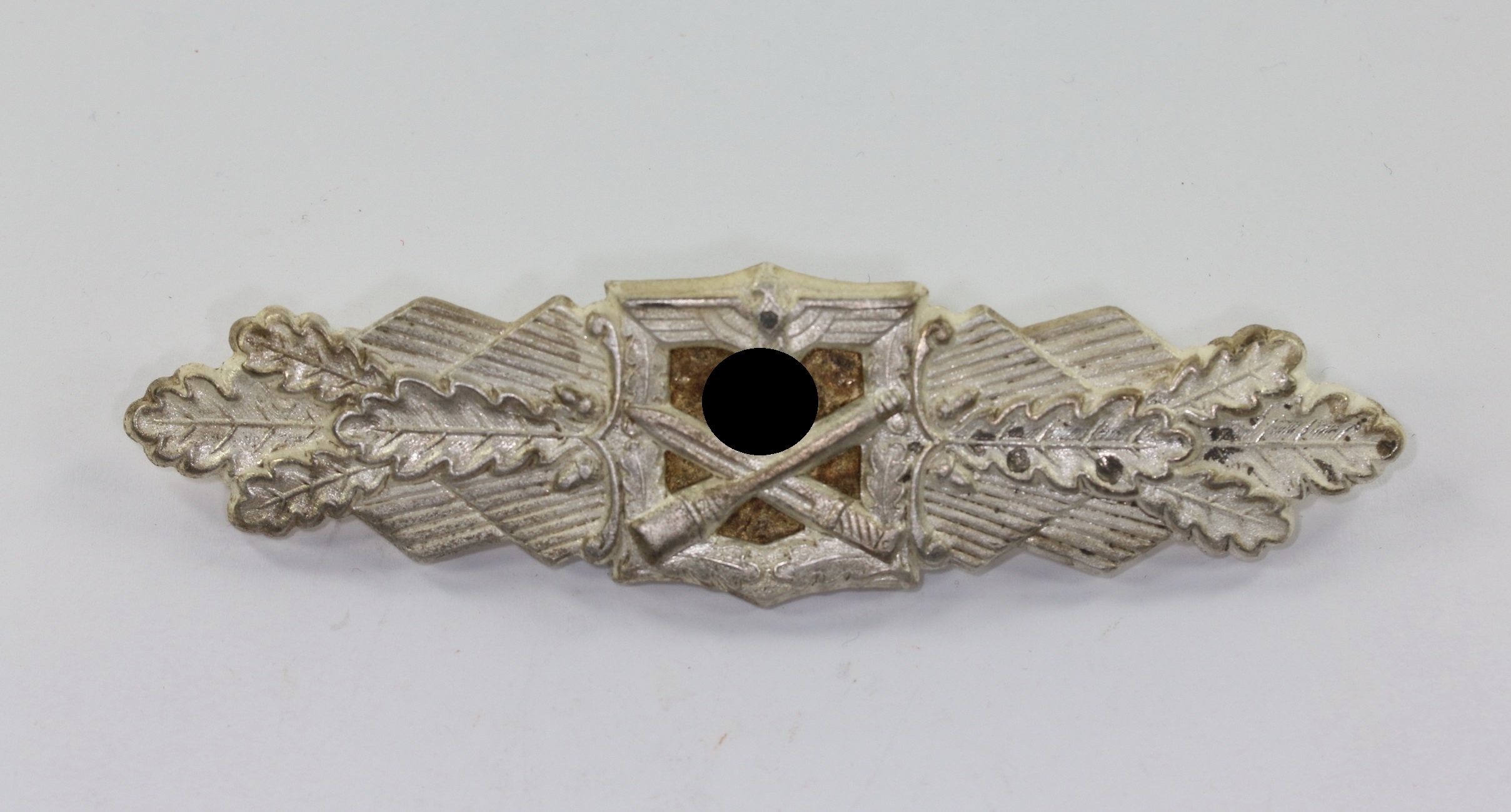 Zink, excellenter, ungetragener Zustand. Mit vollständiger, frostiger Versilberung. Hakenkreuz und Kanten poliert. Mit leichten Ansätzen von Patina. Das magnetische Plättchen mit vollständiger, typischer Tönung. Mit Hersteller „FLL“ für die Firma Friedrich Linden, Lüdenscheid. Siehe Thomas Durante, The German Close Combat Clasp, S. 188/189, Typ 1.14.1.