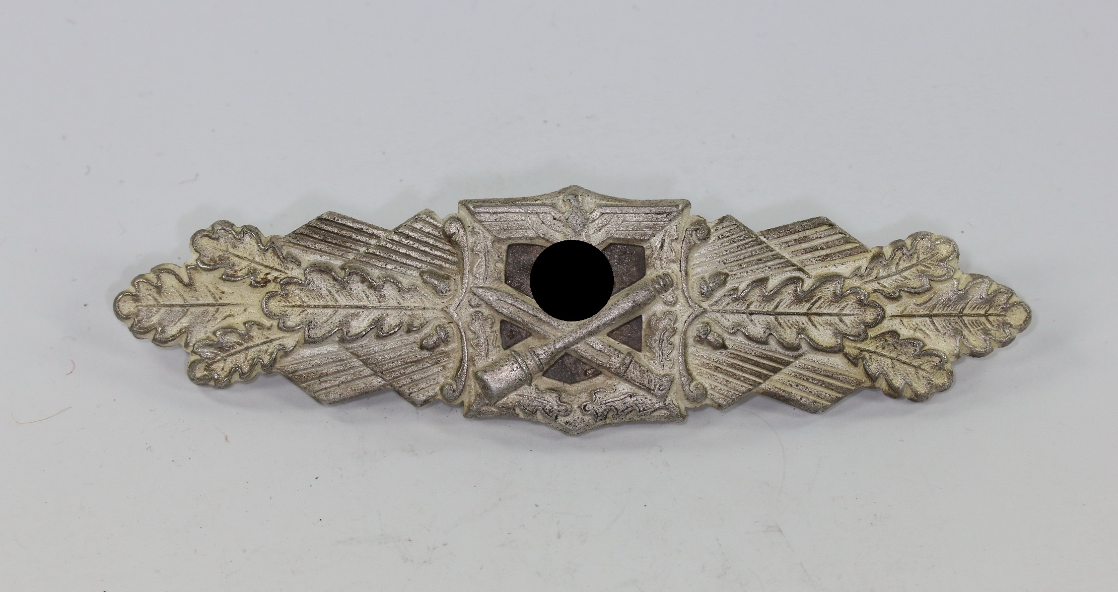 Zink, sehr guter, nahe zu ungetragener Zustand. Mit vollständiger, frostiger Versilberung. Hakenkreuz und Kanten poliert. Mit leichten Ansätzen von Patina. Das magnetische Plättchen mit fast vollständiger Tönung. Mit Hersteller „FLL“ für die Firma Friedrich Linden, Lüdenscheid. Siehe Thomas Durante, The German Close Combat Clasp.