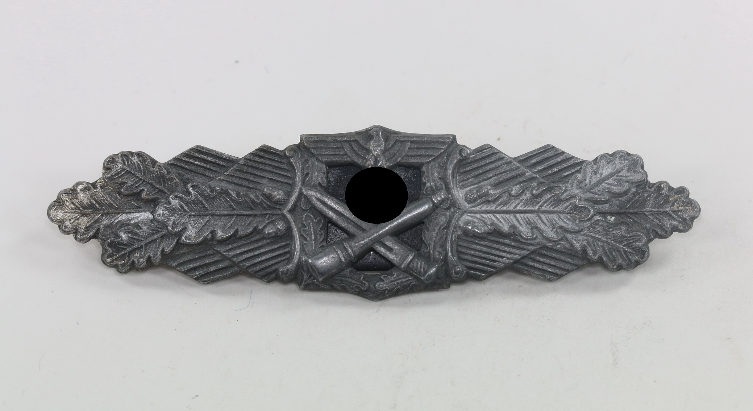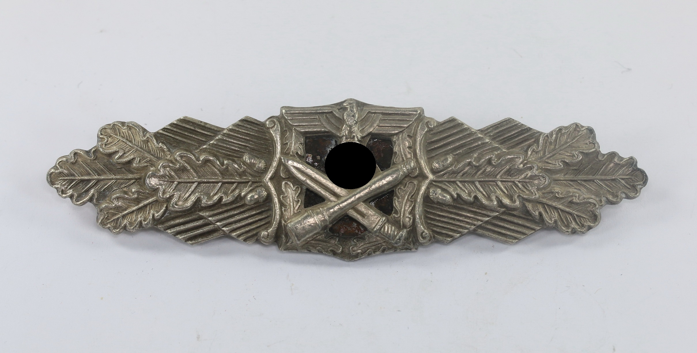 Zink, sehr guter, leicht getragener Zustand. Mit noch schöner Restversilberung. Das magnetische Plättchen mit noch guter Schwärzung. Mit Hersteller „R. S.“ für die Firma Rudlof Souval, Wien. Siehe Thomas Durante, The German Close Combat Clasp.