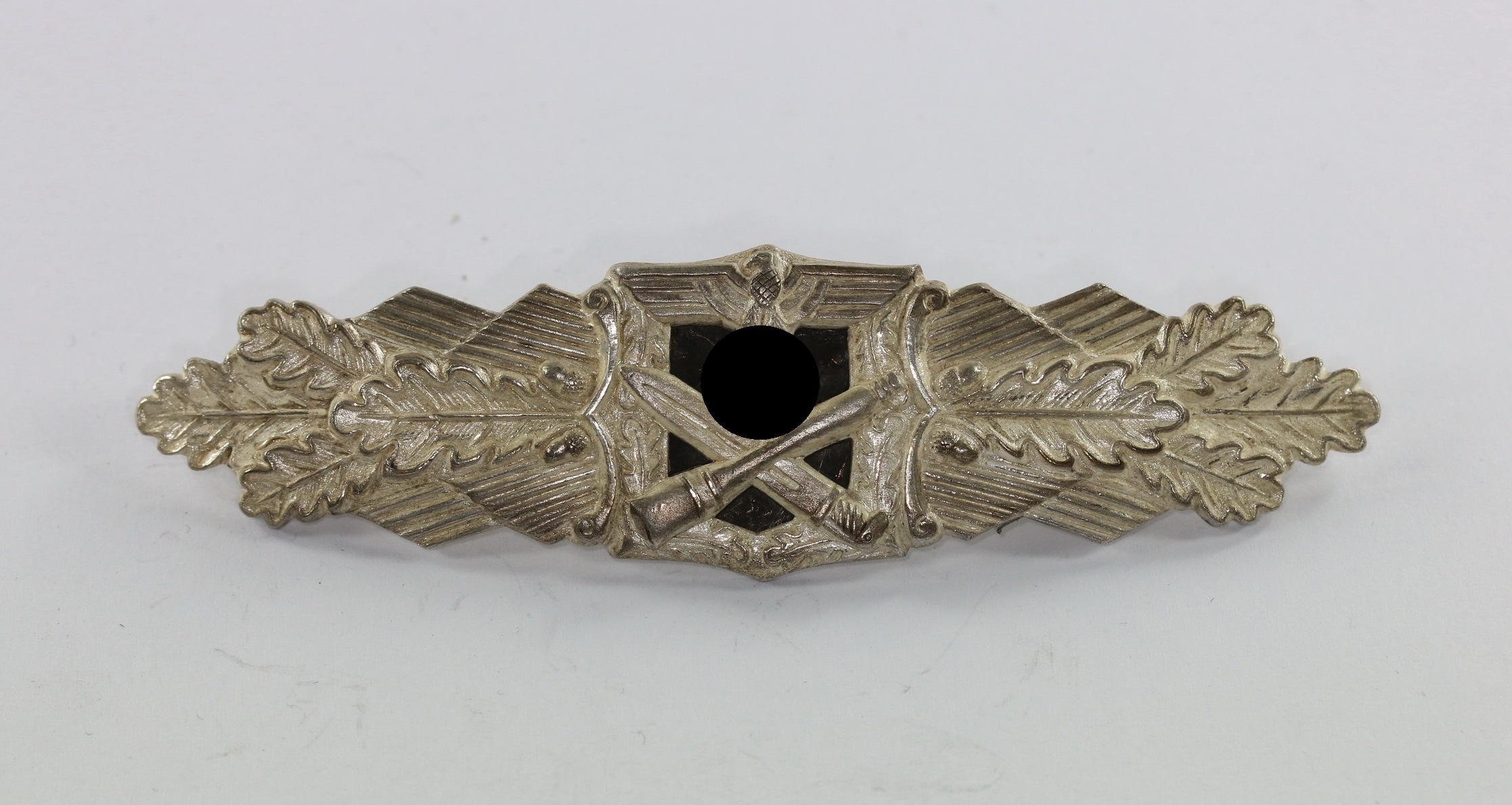 Zink, excellenter, nahe zu ungetragener Zustand. Mit vollständiger Versilberung. Das magnetische Plättchen mit vollständiger Tönung. Ohne Hersteller, aber eine bekannte Variante, die auf Grund der markanten Einquetschung des Plättchens als „Six Dot“ (sechs Punkte) Varinate bekannt ist. Siehe Thomas Durante, The German Close Combat Clasp, S. 242/243, Typ 1.17.1.