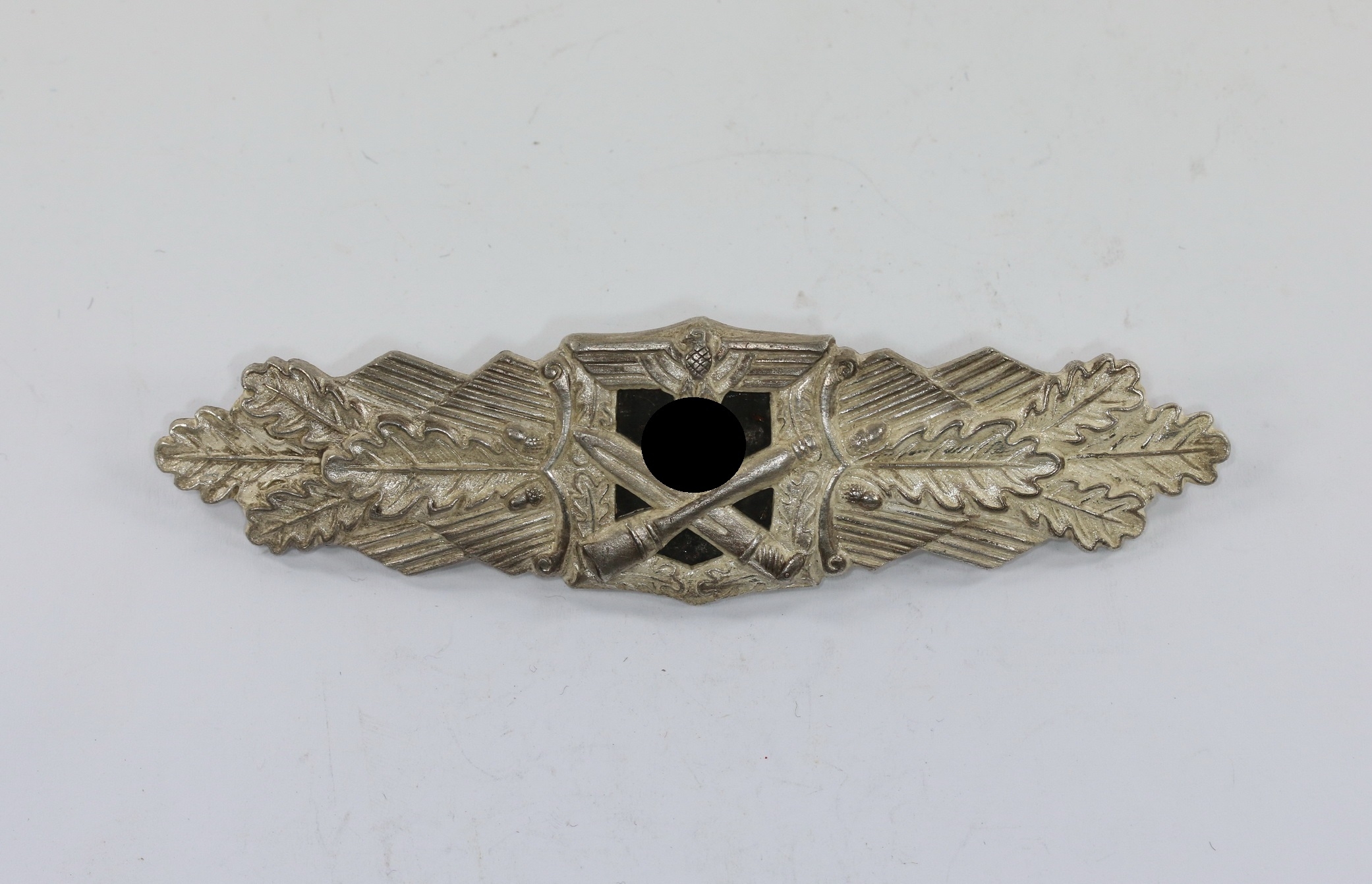 Zink, sehr guter, nur minimal getragener Zustand. Mit vollständiger Versilberung. Das magnetische Plättchen mit vollständiger Tönung. Ohne Hersteller, aber eine bekannte Variante, die auf Grund der markanten Einquetschung des Plättchens als „Six Dot“ (sechs Punkte) Varinate bekannt ist. Siehe Thomas Durante, The German Close Combat Clasp, S. 242/243, Typ 1.17.1.