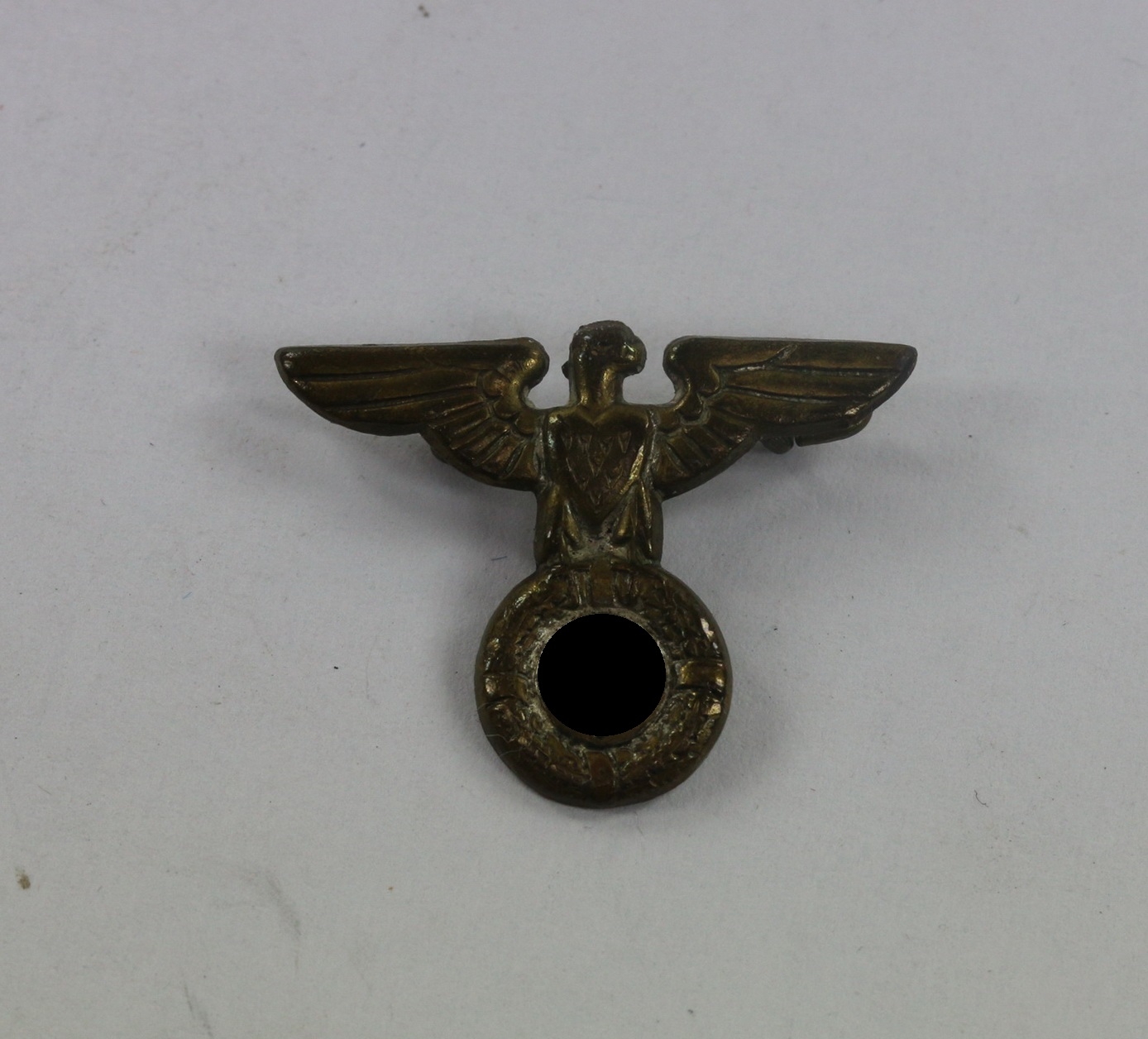 Buntmetall versilbert, das Hakenkreuz schwarz lackiert. Sehr guter, nur minimal getragener Zustand, mit leichter Patina. Ohne Hersteller, aber eine bekannte Variante.