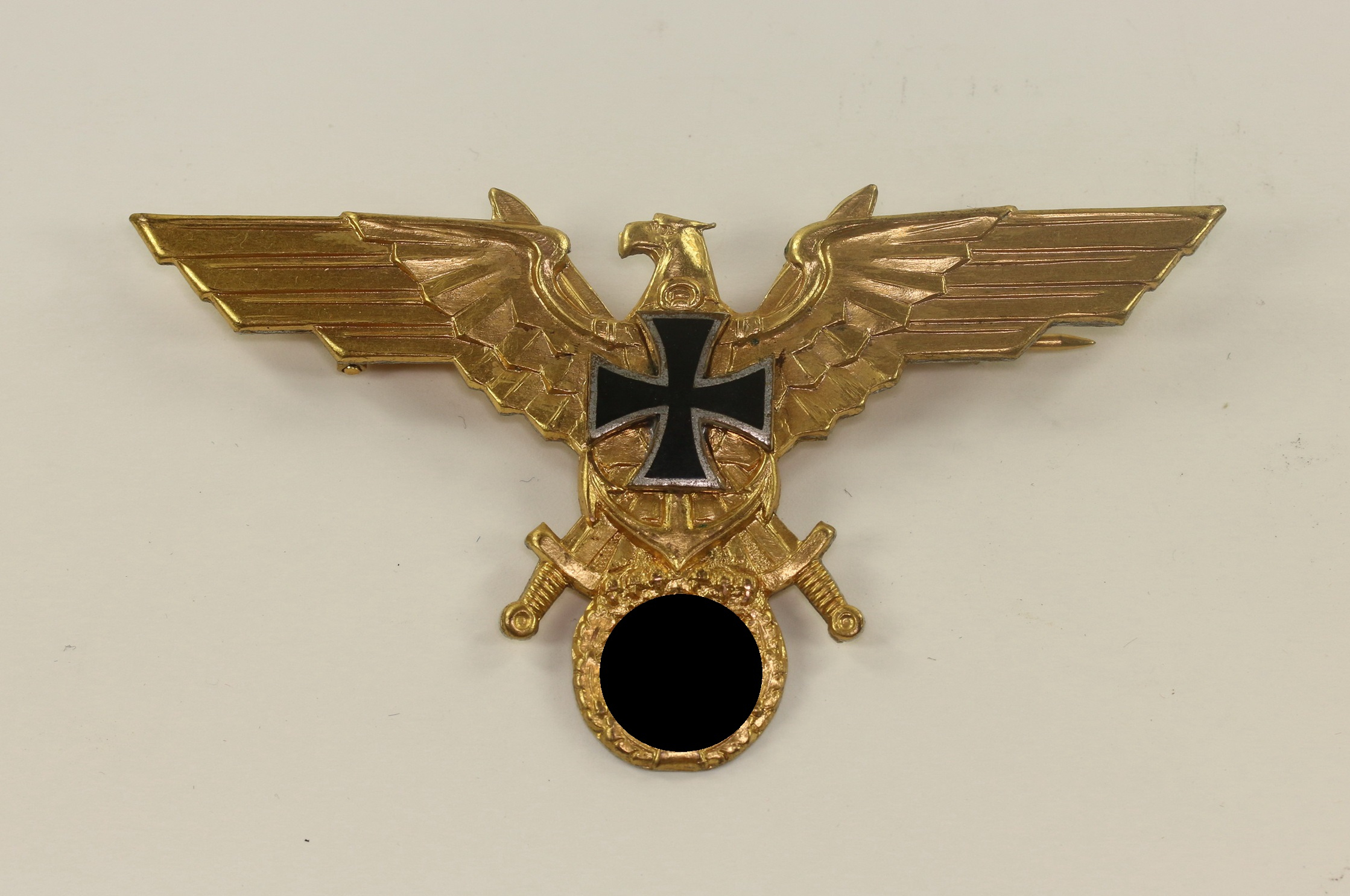 Aluminium vergoldet, das aufgelegte Eiserne Kreuz schwarz emailliert, sehr guter, nur leicht getragener Zustand, die Emaille ohne Fehler. Ohne Hersteller, aber eine bekannte Variante. Rückseitig „Ges. Gesch.“. Spannweite 95 mm.