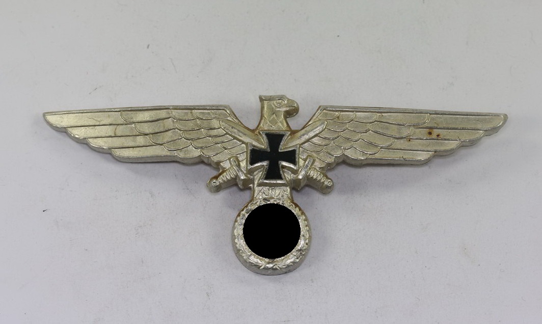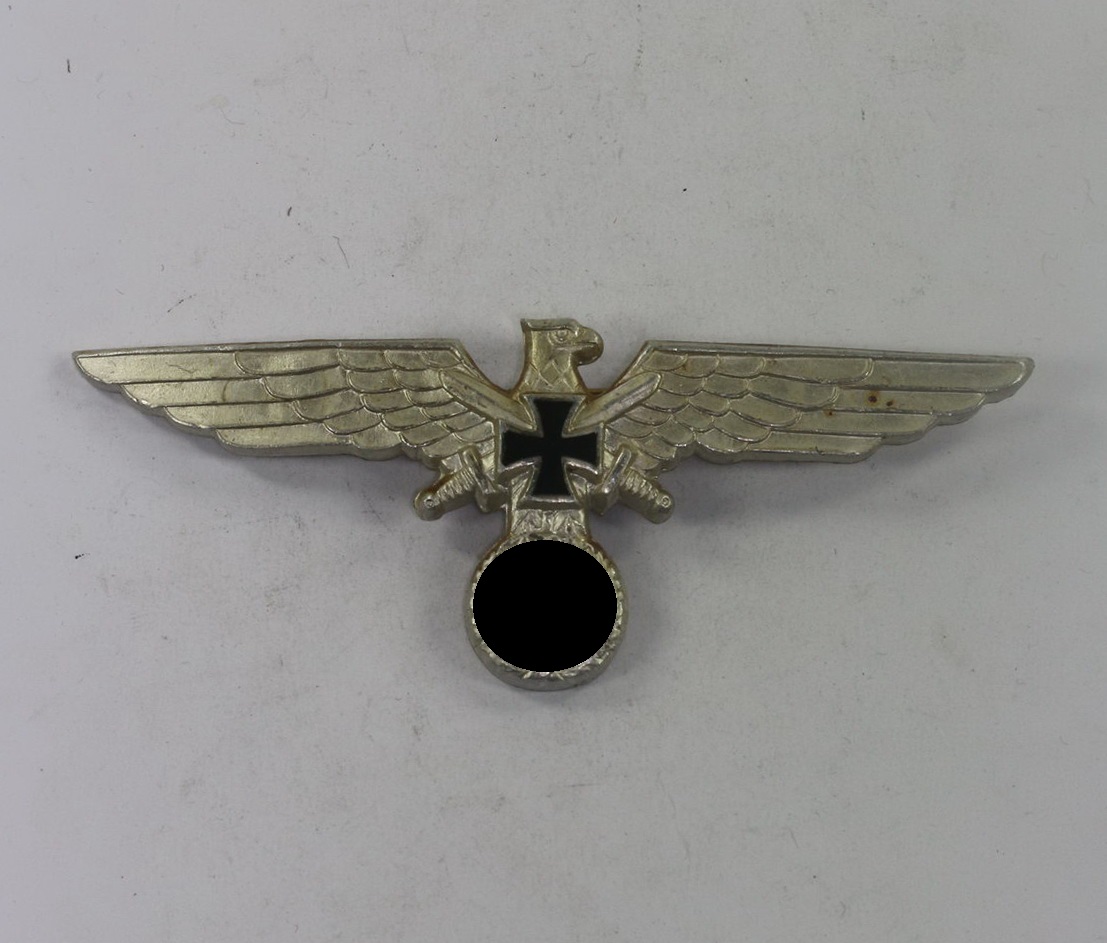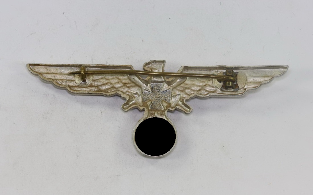 Der Brustadler aus Aluminium, teilweise emailliert. Sehr guter, nur minimal getragener Zustand. Die Emaille ohne Fehler. Rückseitig „2“ und „Ges. Gesch.“.