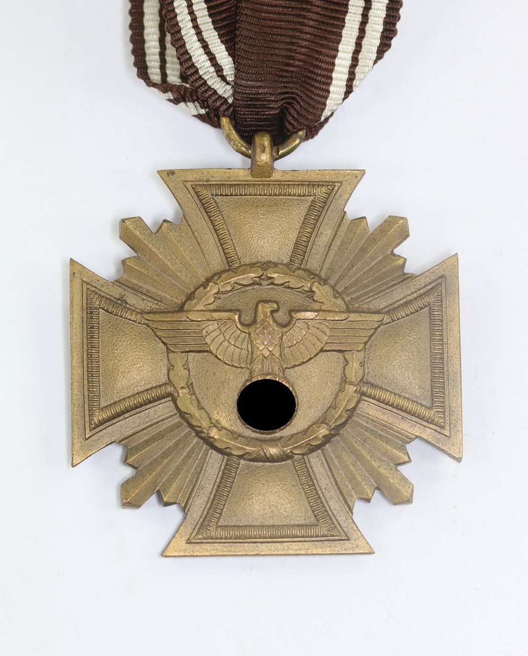 Cupal(!), flache Ausführung. Excellenter, ungetragener Zustand. Mit vollständiger Bronzierung. Im Bandring die Hersteller Markierung „15“, die 15 steht eigentlich für RZM M11/15 aus dem Code System der Reichszeugmeisterei (RZM). Hinter dieser Codierung verbirgt sich die Firma Karl Wurster aus Markneukirchen. Rückseitig „Für Treue für Führer und Volk“. Mit originalem Trageband. Die NSDAP Dienstauszeichnung in Bronze wurde für die Mitgliedschaft von 10 Jahren verliehen.