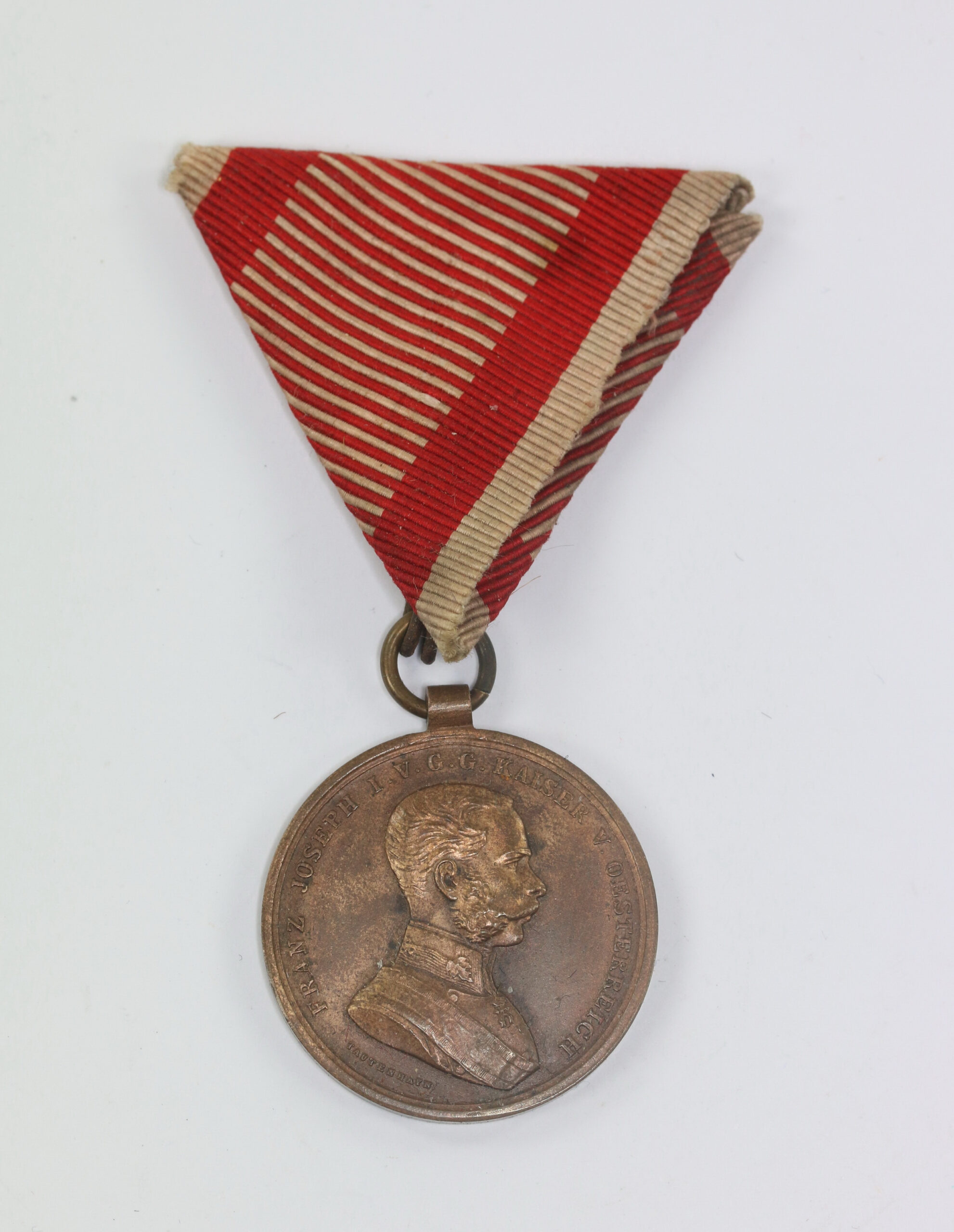 Bronze, sehr guter, leicht getragener Zustand. An Dreiechsband.