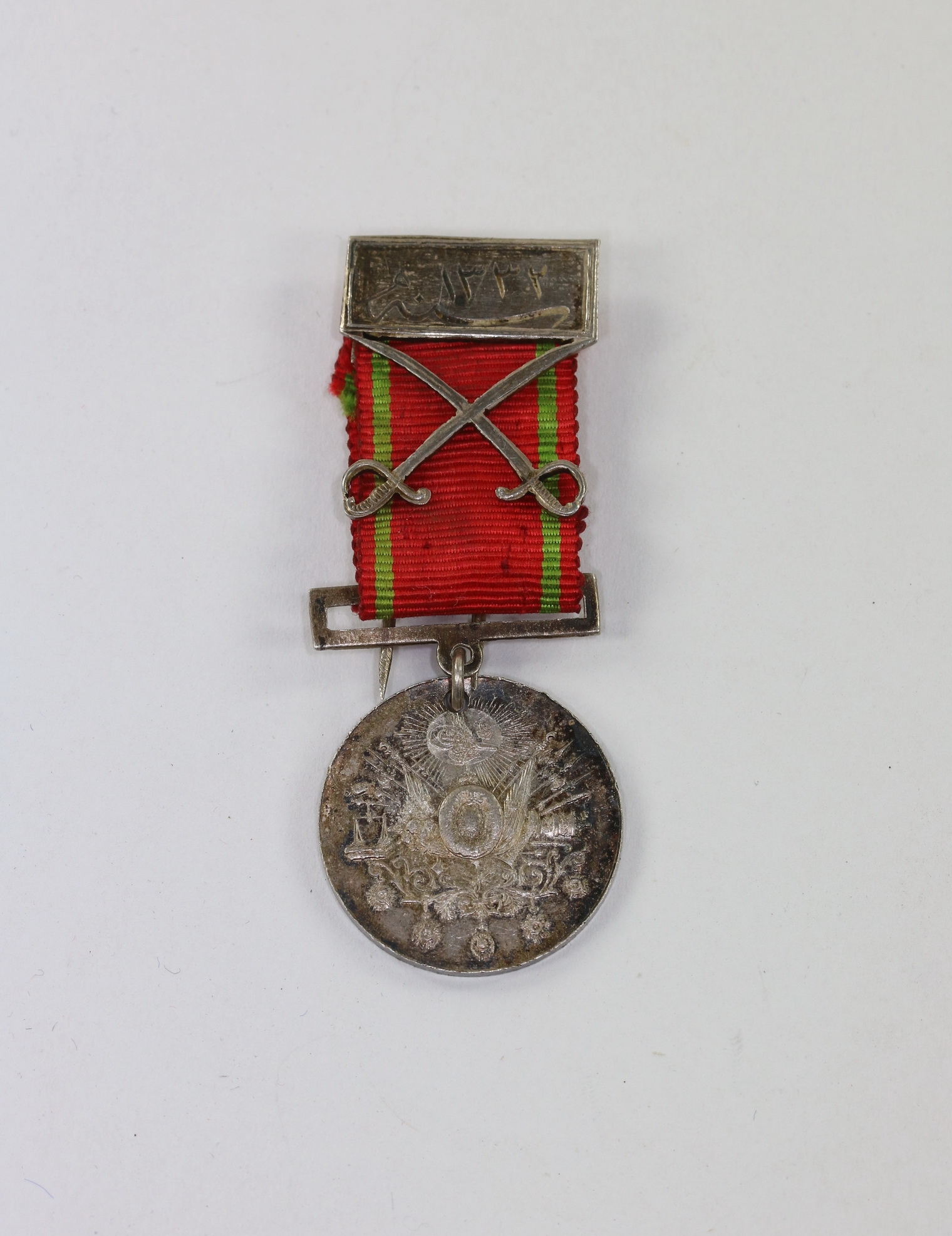 Silber, sehr guter, nur minimal getragener Zustand. Mit aufgelegter Schwertspange. Mit original Band und Befestigungsnadeln. verliehenes osmanisches Stück. Häufug auch an die verbündeten Deutschen verliehen.