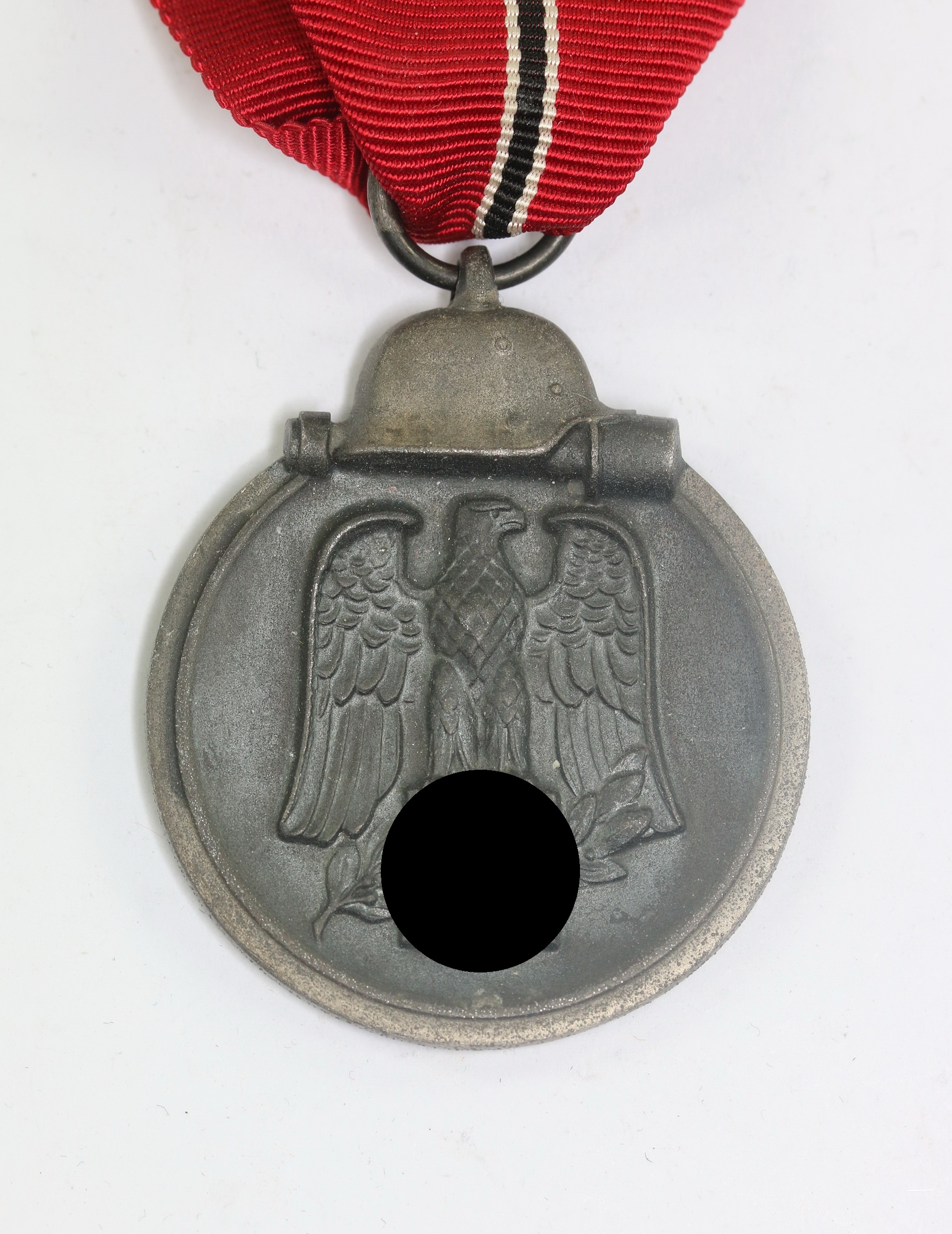 Zink, sehr guter, leicht getragener Zustand. Im Bandring die Hersteller Punze „25.“ für Arbeitsgemeinschaft der Graveur-, Gold- und Silberschmiedeinnungen, Hanau am Main. Mit originalen Trageband.