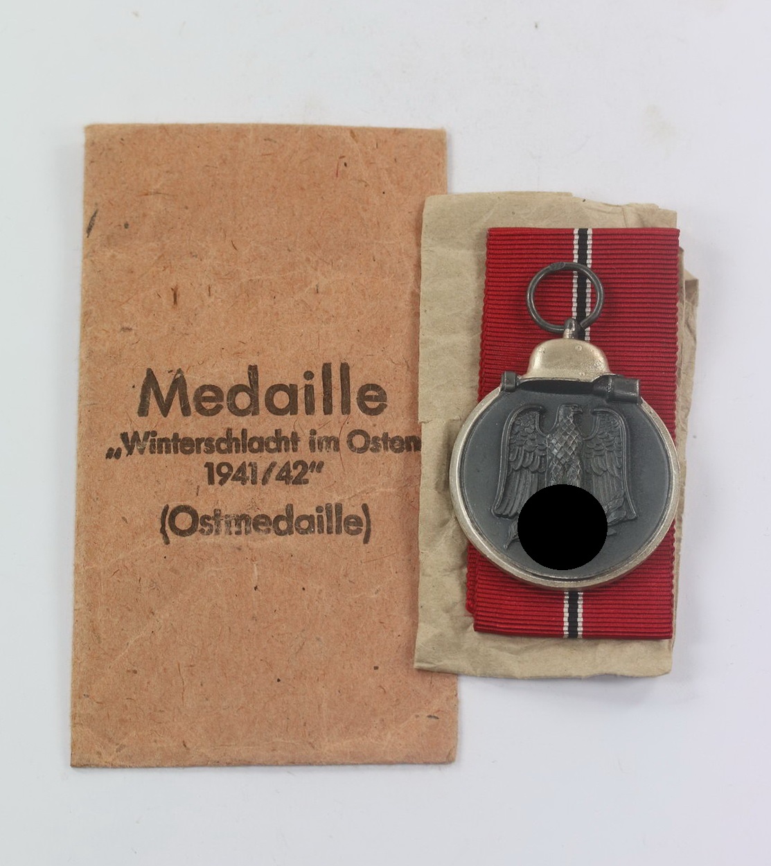 Ostmedaille, Hst. 92, in Verleihungstüte Metalle & Kunststoffe Gablonz, gestempelt Hersteller: Josef Rücker & Sohn (!)