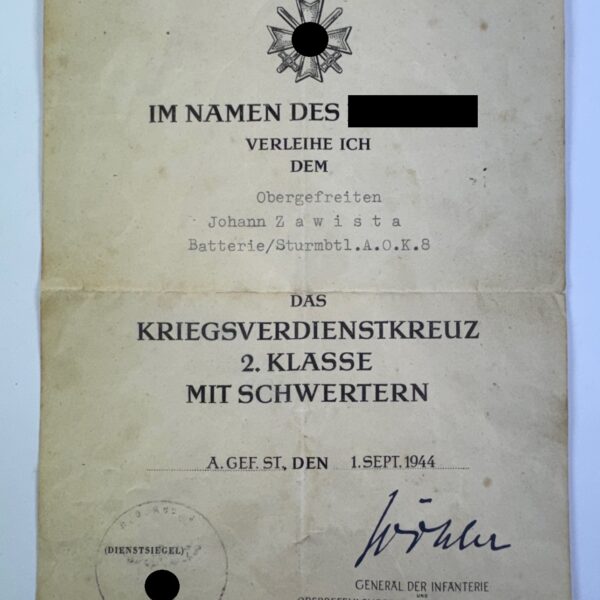 Verleihungsurkunde Kriegsverdienstkreuz 2. Klasse mit Schwertern, Sturm-Bataillon AOK 8 (Armee Oberkommando 8)