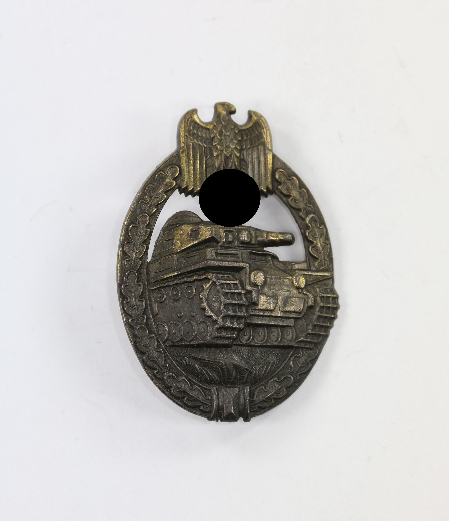 Zink, excellenter, ungetragener Zustand. Mit vollständiger, typischer Bronzierung. Ohne Hersteller, aber eine bekannte Variante, der Firma Gebrüder Wegerhoff, Lüdenscheid (GWL). Siehe Philippe de Bock, The German Panzer Assault Badge.