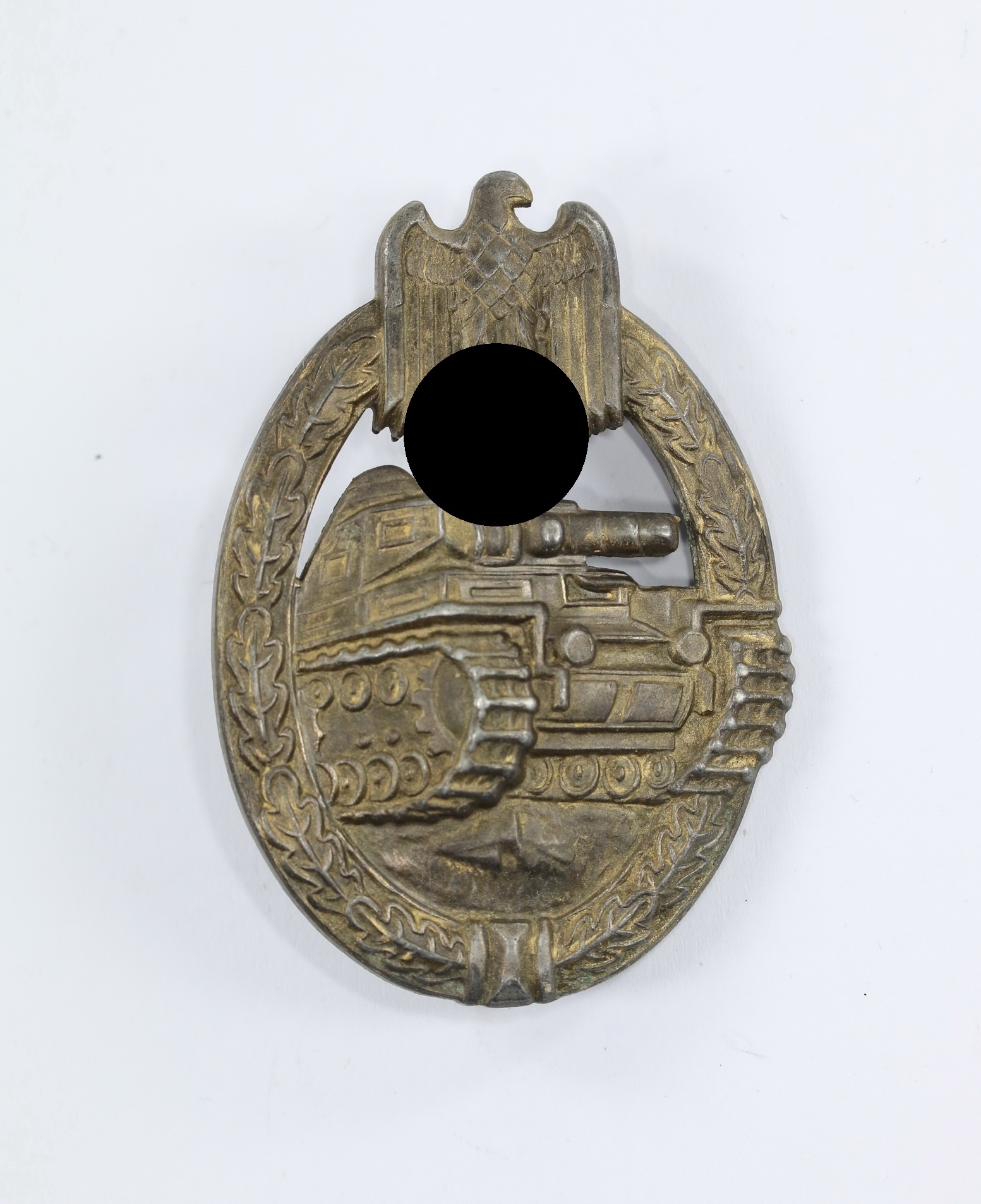 Zink, sehr guter, leicht getragener Zustand. Die mit noch schöner Bronzierung und leichter Patina. Mit Hersteller „Frank & Reif Stuttgart“. Siehe Philippe de Bock, The German Panzer Assault Badge. Der originale Nadelhalen zeitgenössisch verstärkt(!),