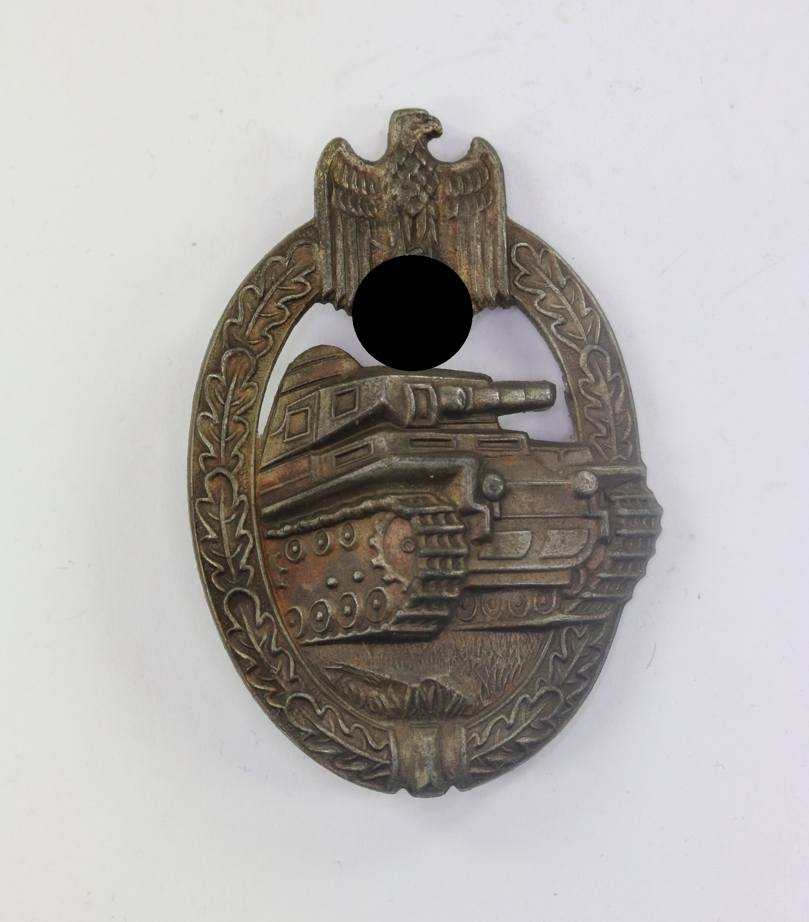 Zink, sehr guter, nahe zu ungetragener Zustand. Mit vollständiger Bronzierung. Mit minimalen Ansätzen von Patina. Mit Hersteller „R.K.“ für die Firma Rudolf Karneth, Gablonz. Siehe Philippe de Bock, The German Panzer Assault Badge.
