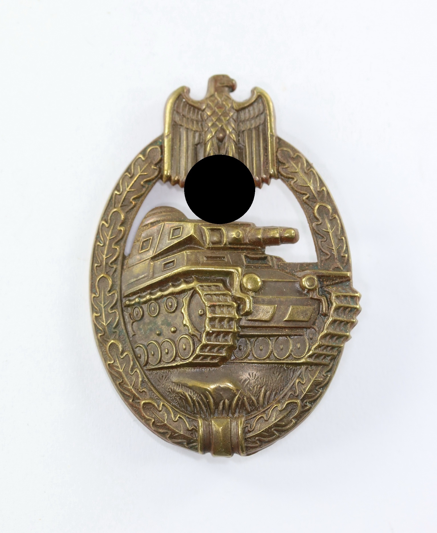Buntmetall, excellenter, ungetragener Zustand. Mit vollständiger Bronzierung. Ohne Hersteller, aber eine bekannte Variante, der Firma Steinhauer & Lück, Lüdenscheid. Siehe Philippe de Bock, The German Panzer Assault Badge S. 132/133, Typ 1.4.2.