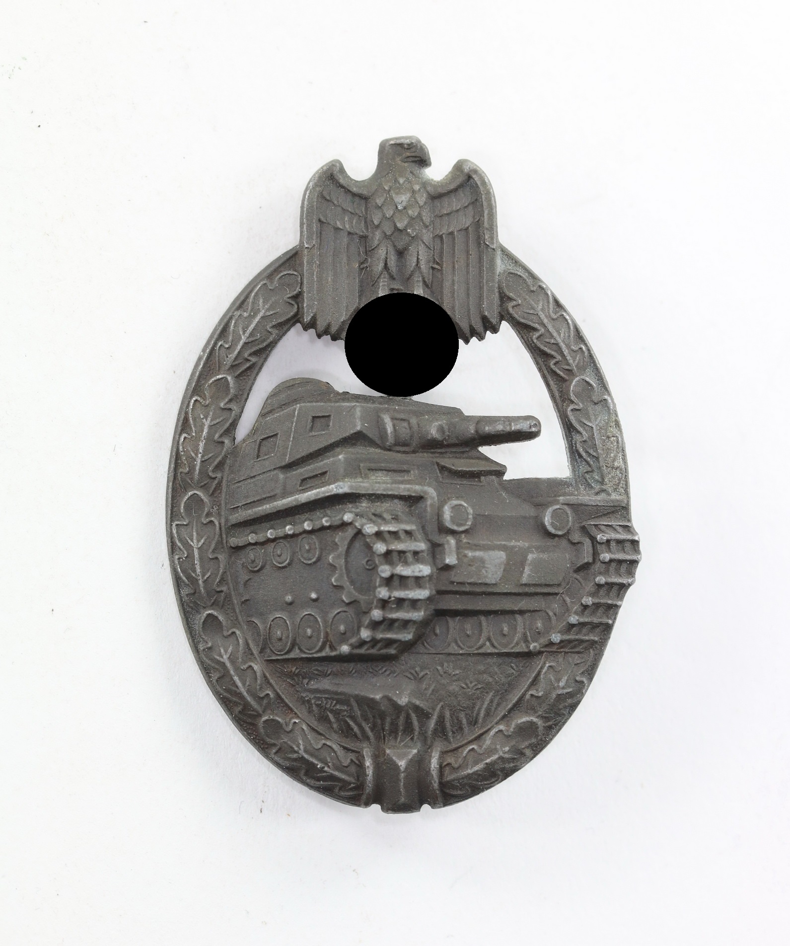 Zink, sehr guter, nur minimal getragener Zustand. Mit vollständiger, dunkler Bronzierung. Ohne Hersteller, aber eine bekannte Variante. Siehe Philippe de Bock, The German Panzer Assault Badge, S. 224/225, Typ 1.9.1 B.
