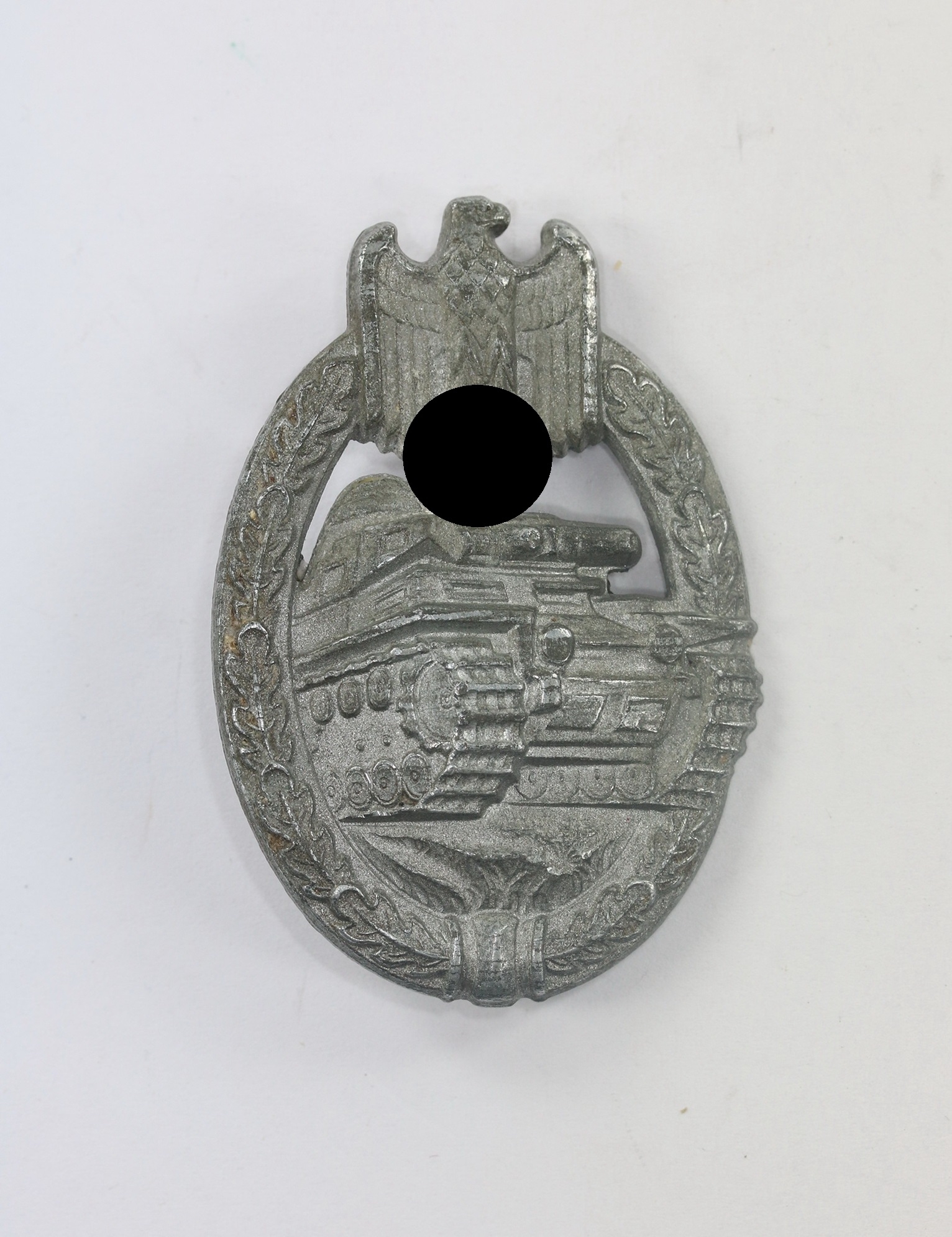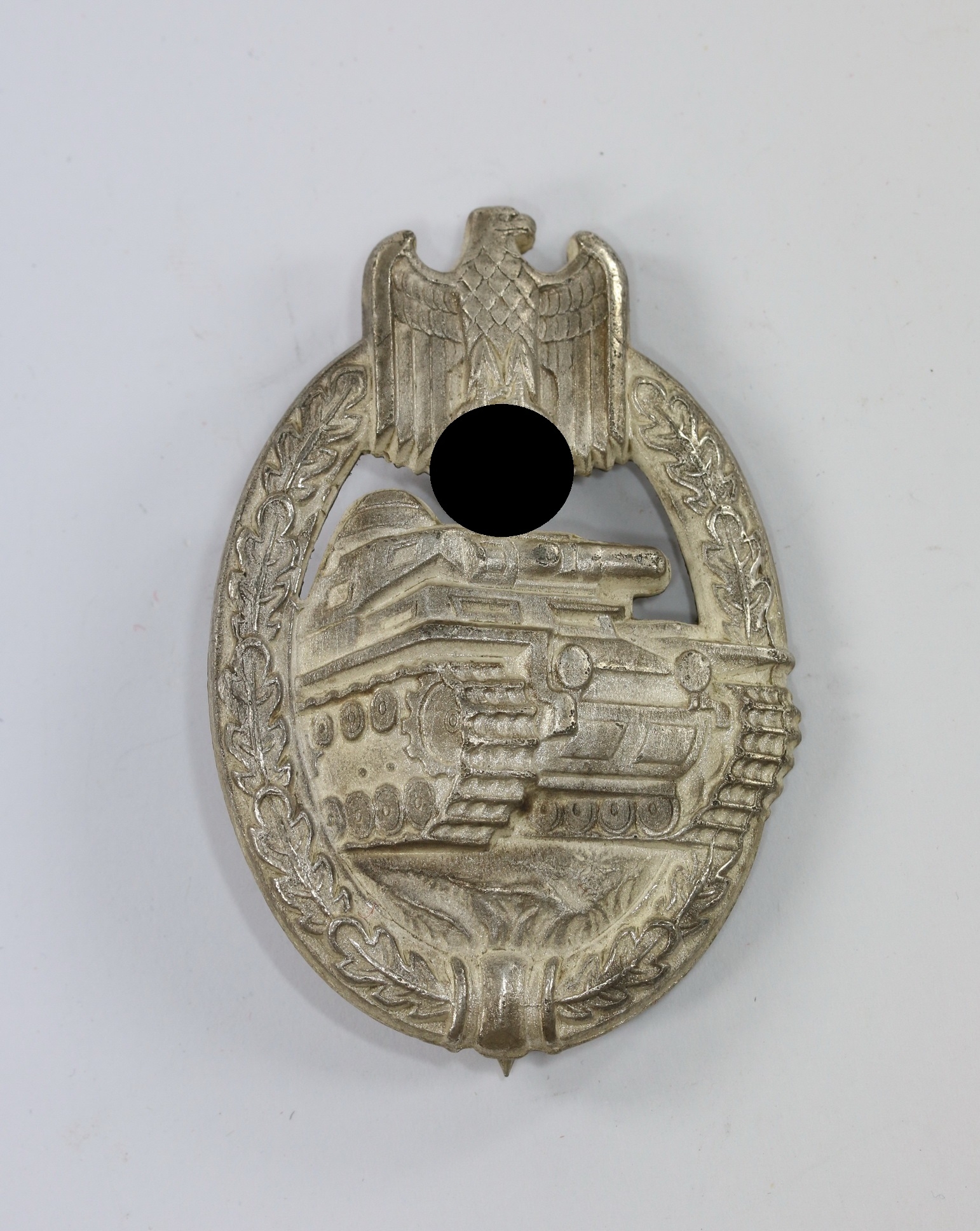 Zink, sehr guter, nur leicht getragener Zustand. Mit typischer Versilberung. Ohne Hersteller, aber eine bekannte Variante, die als „Daisy“ Varinate bekannt ist. Siehe Philippe de Bock, The German Panzer Assault Badge.