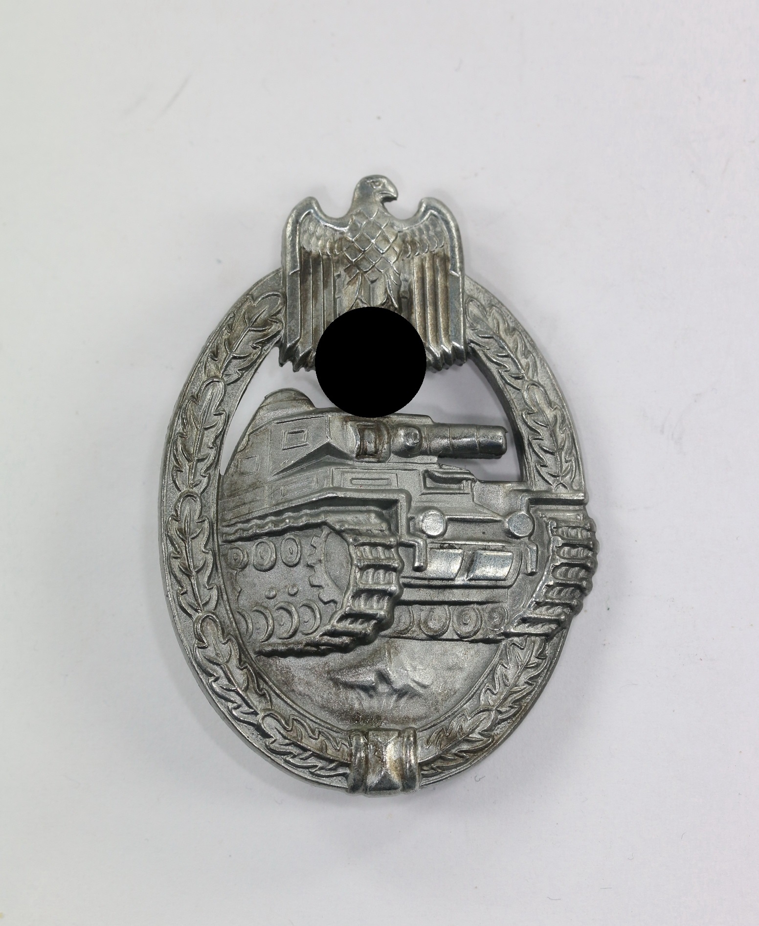 Zink, sehr guter, leicht getragener Zustand. Mit vollständiger Versilberung. Ohne Hersteller, aber eine bekannte Variante der Firma Frank & Reif, Stuttgart. Siehe Philippe de Bock, The German Panzer Assault Badge.
