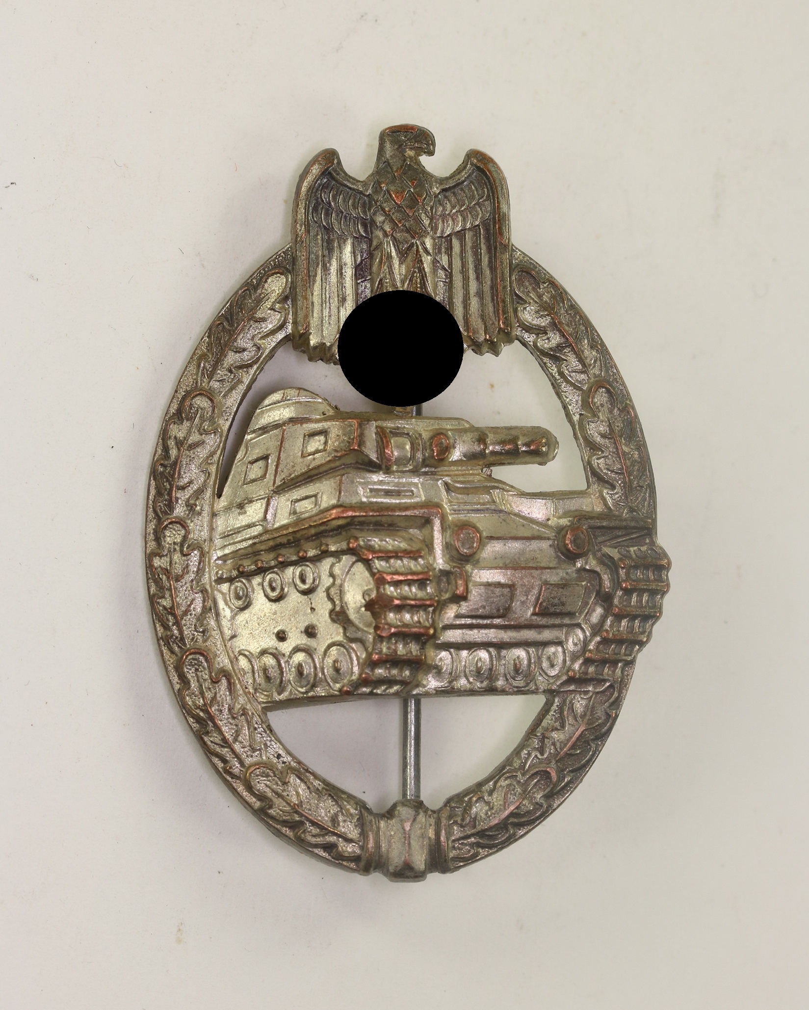 Cupal(!), sehr guter, nur leicht getragener Zustand. Mit fast vollständiger, frostiger Versilberung. Mit Hersteller „A“ für die Firma Assmann & Sohn, Lüdenscheid. Siehe Philippe de Bock, The German Panzer Assault Badge.