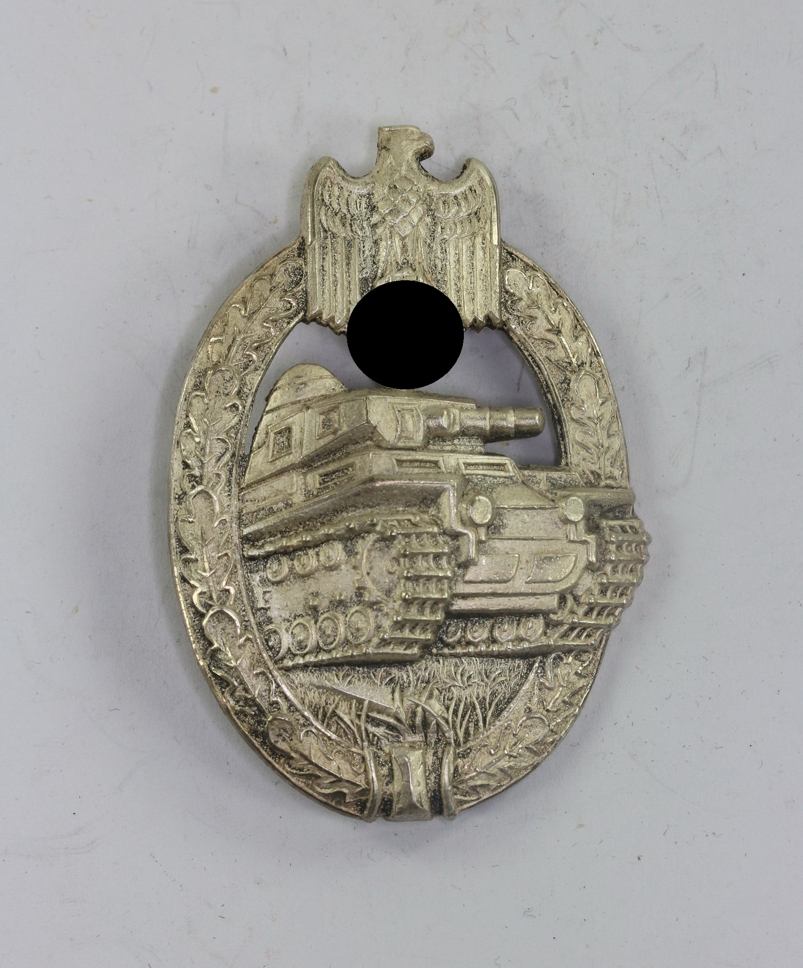 Zink, sehr guter, ungetragener Zustand. Mit vollständiger Versilberung. Hakenkreuz und Kanten poliert. Mit Hersteller „A.S.“ für die Firma Adolf Scholze, Gablonz. Siehe Philippe de Bock, The German Panzer Assault Badge