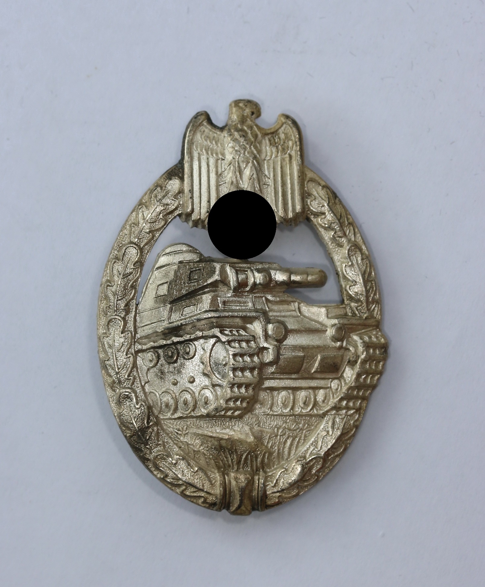 Zink, excellenter, ungetragener Zustand. Mit vollständiger, frostiger Versilberung. Mit Hersteller „A“ für die Firma Assmann & Sohn, Lüdenscheid. Siehe Philippe de Bock, The German Panzer Assault Badge.