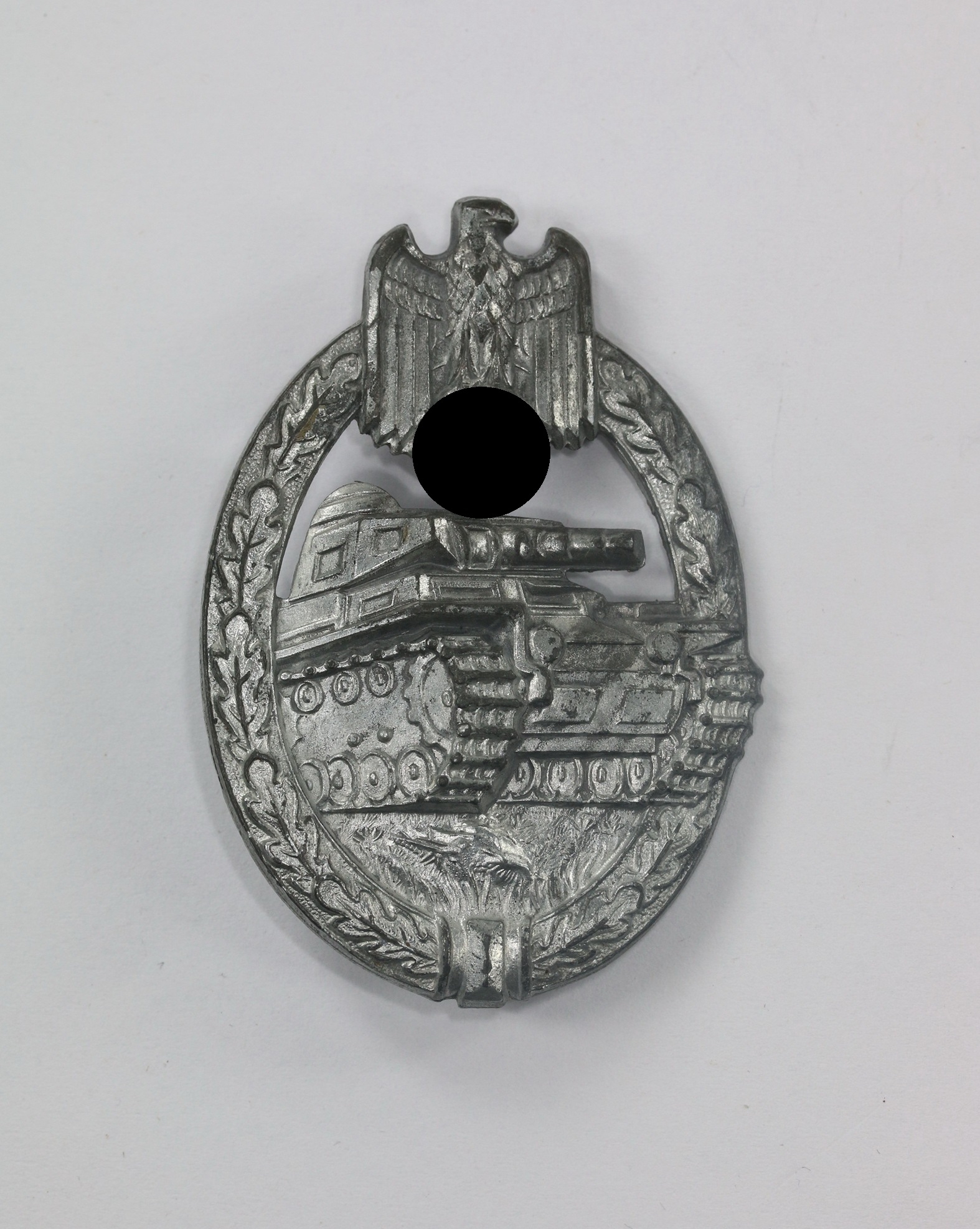 Zink, sehr guter, leicht getragener Zustand. Mit vollständiger Versilberung und schöner Patina. Mit Hersteller „HA“ für die Firma Hermann Aurich, Dresden. Siehe Philippe de Bock, The German Panzer Assault Badge.